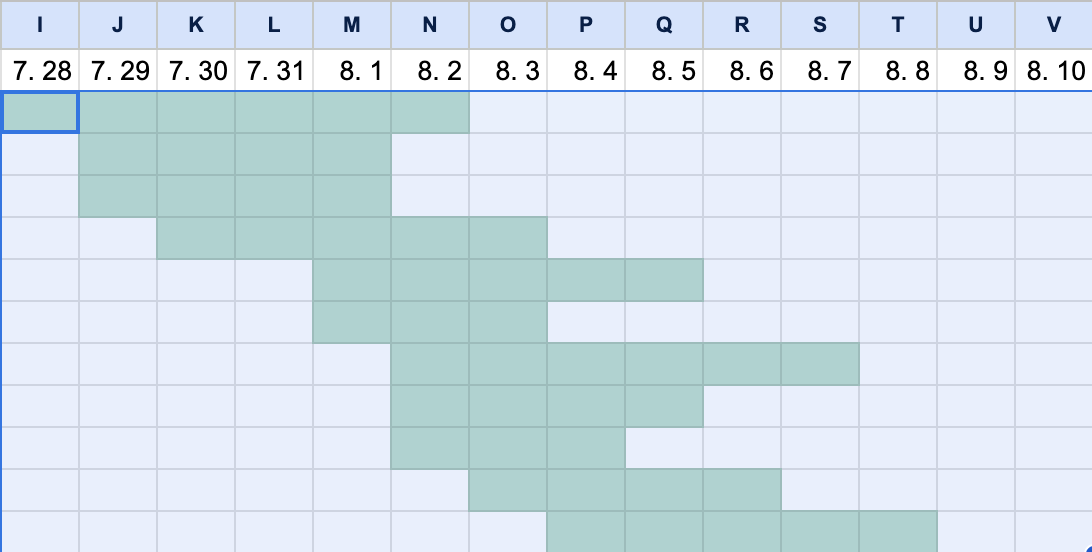 • 맞춤 수식에서 '=AND(I1>=1>=E2, I1<=1<=F2)' 입력 후 서식 지정