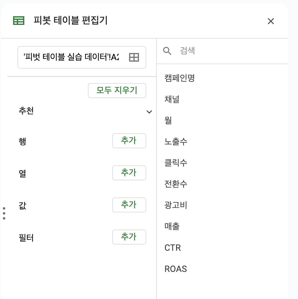 • 전체 데이터 선택 후 '삽입 - 피봇' 테이블 클릭