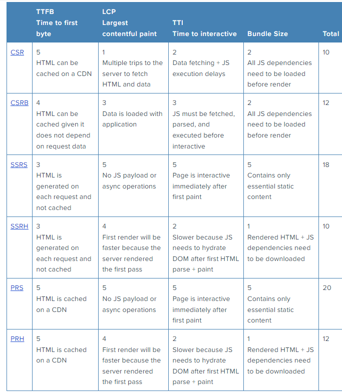 Pre-rendering to static content(PRS)은 가장 뛰어난 성능의 웹사이트를 만드는 반면, server-side rendering with hydration(SSRH)나client-side rendering(CSR)은 기대에 미치지 못하는 결과를 낼 수 있습니다.