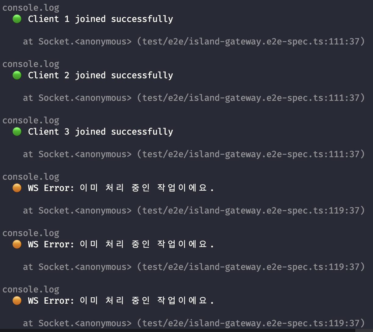 모든 출력 값을 가져오진 못 했지만 3번의 요청만 성공하고 나머지는 모두 이미 처리 중 혹은 섬이 가득 찼다는 응답과 함께 실패하게 되었습니다.