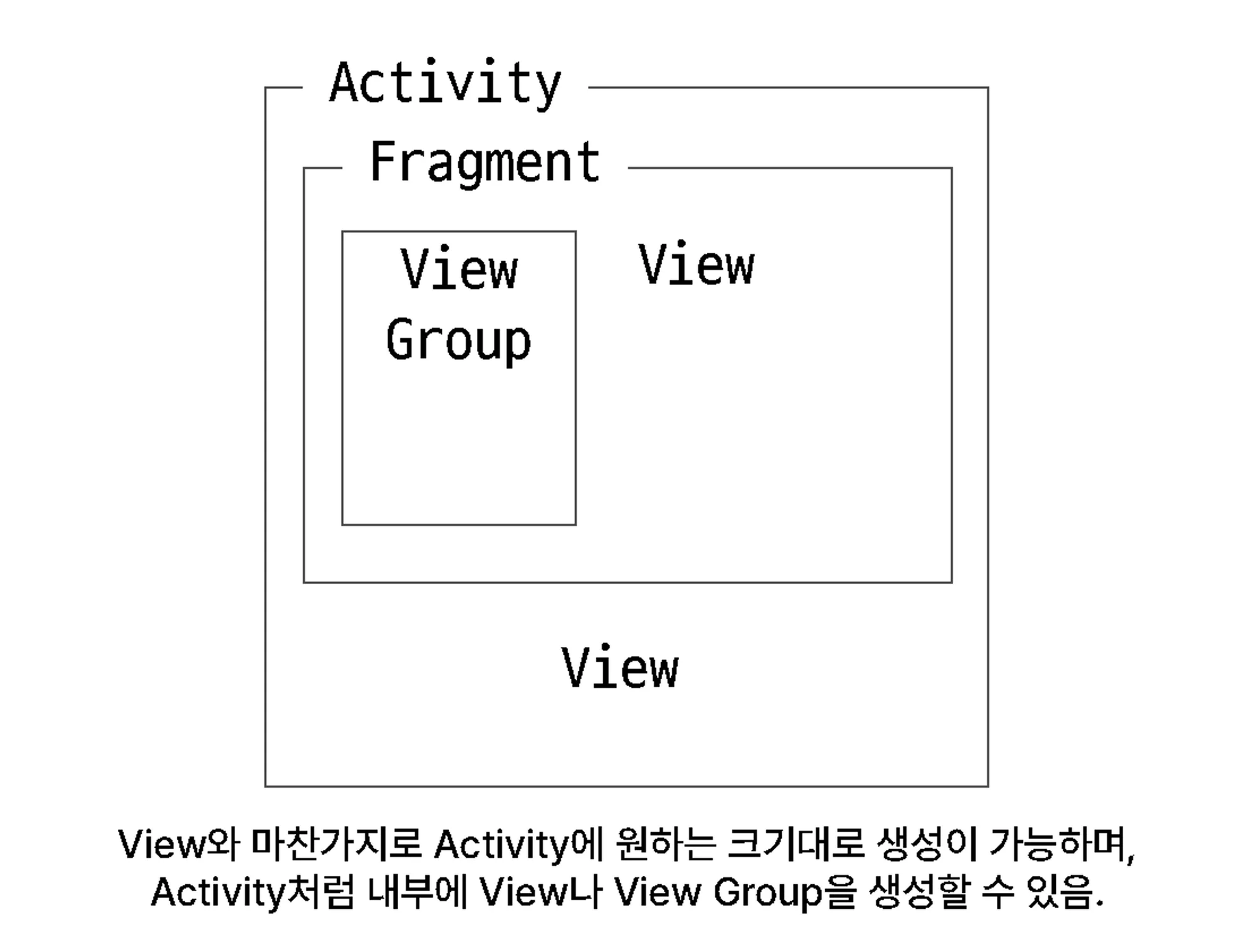 - 한마디로 정라히자면 : activity라는 화면이 있어야 Fragment라는 UI의 조각을 붙일 수 있는 것