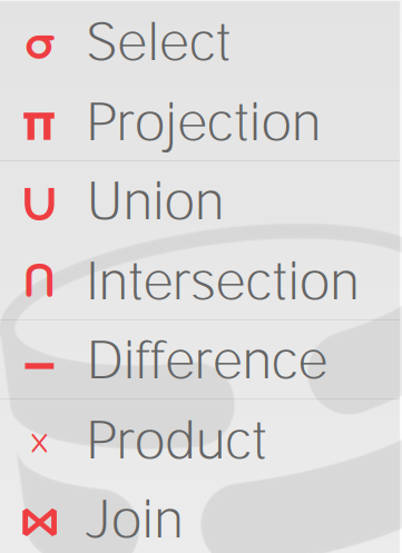 Relational algebra는 relation에 있는 연산들을 반환하고 조작하는 기본 연산들의 집합이다. 각 연산자는 하나 또는 더 많은 relation을 입력으로 받고 새로운 relation을 출력한다. 쿼리를 쓸 때 연산자들을 chain함으로써 더 복잡한 연산을 작성할 수 있다.