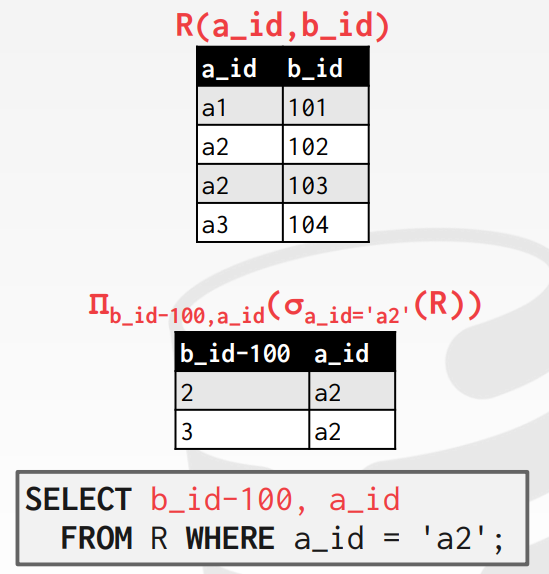 위의 테이블에서 a_id가 a2인 select 연산을 마친 후 R 테이블의 a_id과 b_id 칼럼에서 100을 빼준 칼럼을 선택한다.