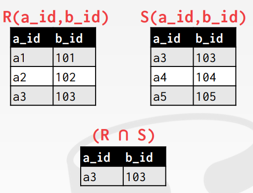 위의 R과 S를 intersection한 결과와 join한 결과가 같아서 헷갈린다. Intersection의 경우 두 개의 relation들은 정확히 같은 속성을 가져야하는 반면에, 테이블에선 공유되는 이름이 동일하지 않은 추가 속성이 있을 수 있다. 예를 들어서 R 테이블에만 c_id라는 속성이 있으면 은 빈 테이블이 되지만, 는 하나의 a3 entity를 갖는 테이블이 반환된다.