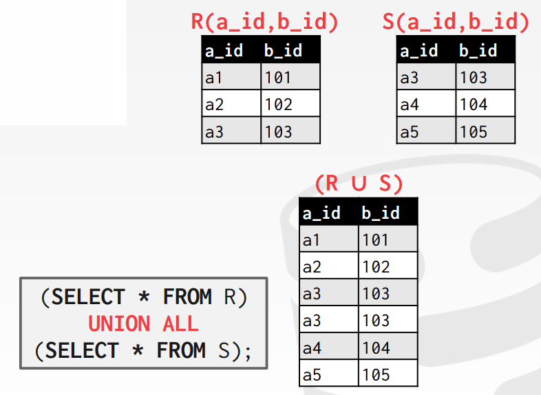 Union 연산은 두 개의 relation을 입력받아 해당 relation들에 나타나는 모든 튜플을 출력한다. 이때 주의할 점은 입력받는 두 개의 relation들은 정확히 같은 속성을 가지고 있어햐 한다는 점이다. SQL의 UNION ALL 구문이 union 역할을 한다.