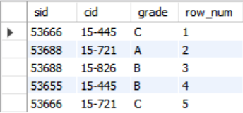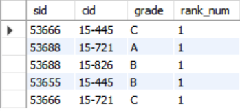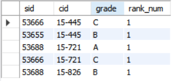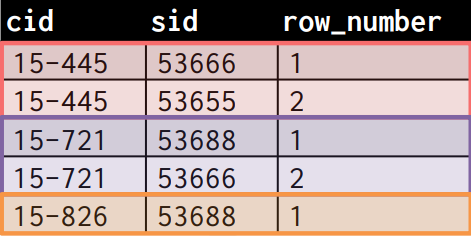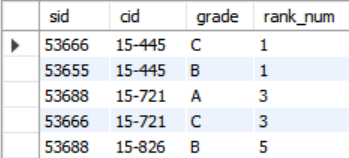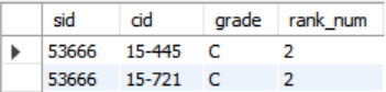 rank_num이 같고, 다음 cid인 '15-721'에선 rank_num이 2가 아니라 cid가 '15-445'인 튜플이 2개 있으므로 3인 것을 알게 되었다.