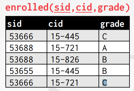 INSERT INTO enrolled VALUES (53666, '15-445', 'C');