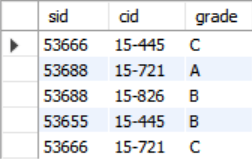 INSERT INTO enrolled VALUES (53655, '15-445', 'B');