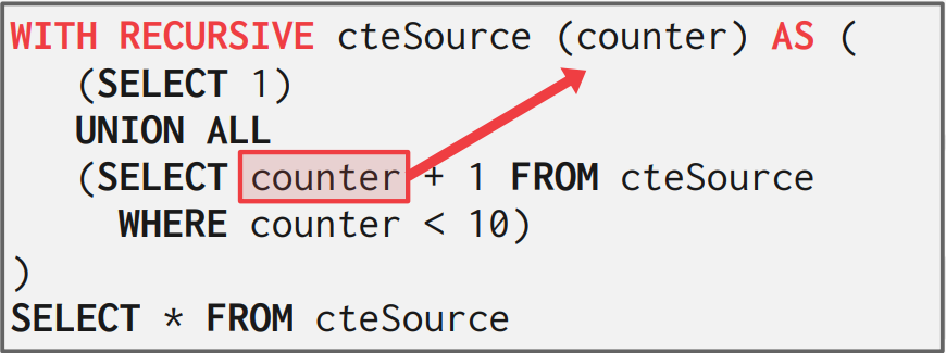 RECURSIVE 명령어는 스스로를 참조할 수 있게하여 재귀를 SQL문으로 작성할 수 있도록 한다. 이는 nested query로는 불가능한 기능이다.