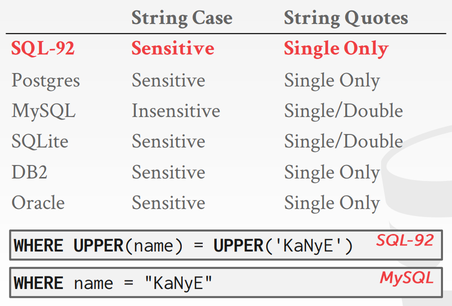 String 연산에 대하여 알파벳 대소문자를 대부분의 SQL 언어에선 구분하지만, MySQL의 경우 구분하지 못한다. 또한 문자열을 나타낼 때 ''가 아닌 '을 사용하는 것이 언어를 불문하고 통용되므로 '를 사용하도록 하자.