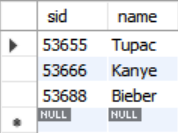 INSERT INTO student VALUES (53655, 'Tupac', 'shakur@cs', 25, 3.5);
