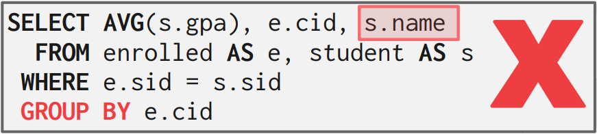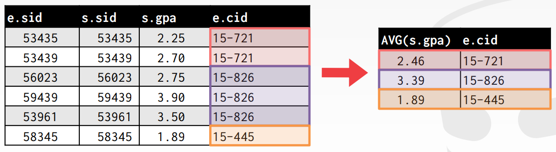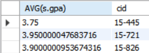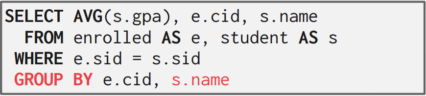 AVG(s.gpa)의 경우 enrolled와 student 테이블의 sid가 일치하는 모든 학생들의 gpa의 평균을 구한다. Enrolled의 cid가 모두 다르므로 반환을 하지 못한다. 이때, 만약 cid별로 묶어서 AVG(s.gpa)를 구한다면 cid와 해당 강좌에 대한 평균 gpa를 구할 수 있을 것이다. 다시 말해서, 튜플들을 부분 집합으로 나눠서 aggregate를 각 부분 집합에 대해서 수행하면 된다. 이러한 기능을 해주는 명령어가 GROUP BY이다. 마지막에 GROUP BY e.cid;를 추가해주었다.