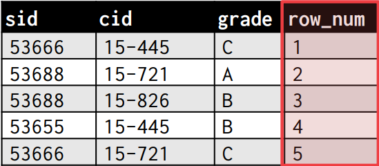 ROW_NUMBER는 row_num이라는 새로운 칼럼을 생성하는데 output 튜플들이 생성된 순서대로 순서가 정해진다.