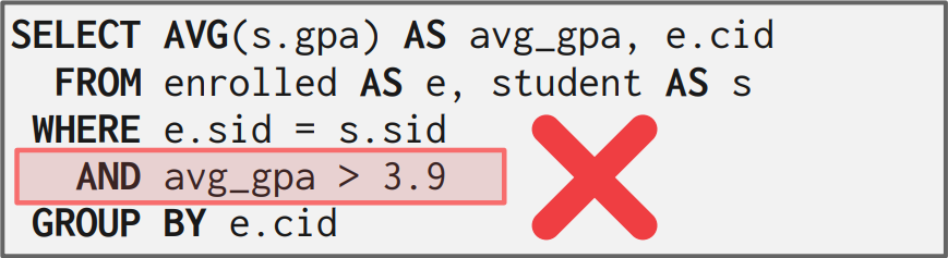 칼럼에 대한 필터가 아닌 aggregation function의 결과에 대한 필터링을 수행하기 위해선 HAVING 절을 사용한다. WHERE 절은 GROUP BY를 수행하기 전에 확인하므로 WHERE 절에 aggregation function의 결과에 대한 필터링을 수행할 수 없다. WHERE 절에 AND로 aggregation function의 결과에 대한 필터링을 다음과 같이 수행했을 때 avg_gpa가 칼럼이 아니라는 에러가 발생한다.