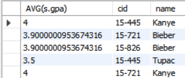참고로 MySQL에 HAVING avg_gpa > 3.9이 돌아가지만 표준 SQL에 따르는 더 좋은 표현법은 HAVING AVG(s.gpa) > 3.9이다.
