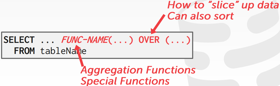Window function은 관련된 튜플 집합에 대하여 sliding 연산을 수행한다. Aggregation과 비슷한 기능을 가지고 있으나, aggregation과 달리 하나의 튜플 결과를 내놓지 않는다. 기본적인 형식은 다음과 같다.