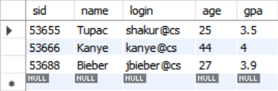 INSERT INTO student VALUES (53666, 'Kanye', 'kanye@cs', 44, 4.0);