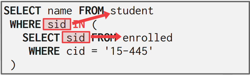 쿼리문을 뜯어보면 inner query로 student id의 집합을 생성한 후, outer query에 있는 모든 튜플에서 그 튜플이 존재하는지 확인하는 방법은 비효율적이다. 그에 반해 outer query에 대하여 inner query를 확인하는 방법은 효율적이다. DBMS는 쿼리 최적화를 위해 이러한 최적화 선택을 한다.