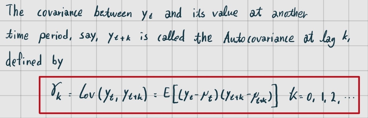 이때 를, 를 parameter로 취하는 하나의 함수로 볼 수 있다. 이를 Autocovariance Function이라고 부른다.
