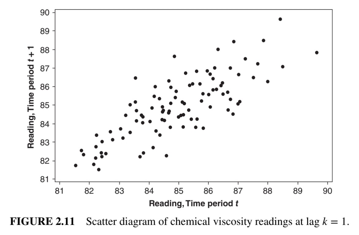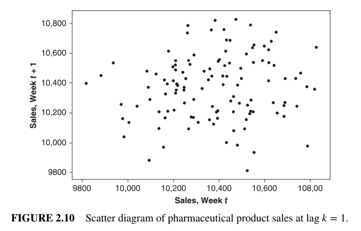 위 두 그림은 모두 lag가 1일 때의 scatter plot이다. 이때 figure 2.10은 데이터 간이 uncorrelated한 것으로 보이고, figure 2.11은 데이터 간이 positively correlated한 것으로 보인다.