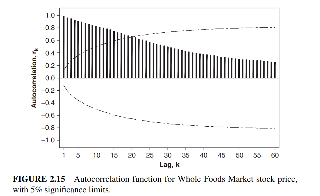 figure 2.12는 stationary한 데이터의 ACF plot이고, figure 2.15는 nonstationary한 데이터의 ACF plot이다. 2.12는 0 근처로 수렴하고, 2.15는 그렇지 않은 것을 확인할 수 있다.