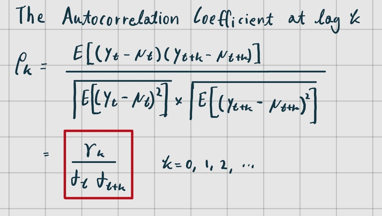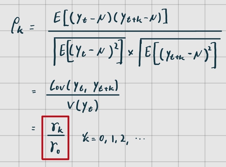 autocovariance의 경우와 마찬가지로 를, 를 parameter로 취하는 하나의 함수로 볼 수 있다. 이를 Autocorrelation Function(ACF)라고 부른다.