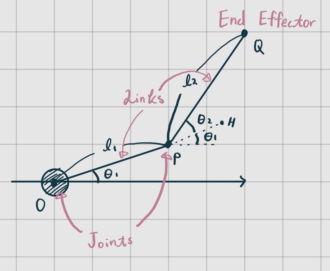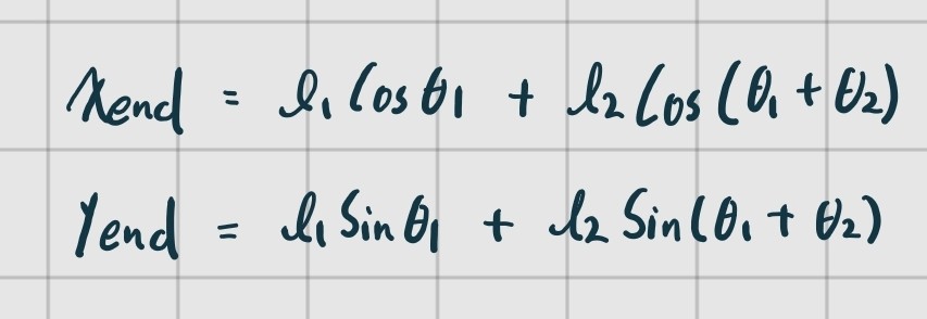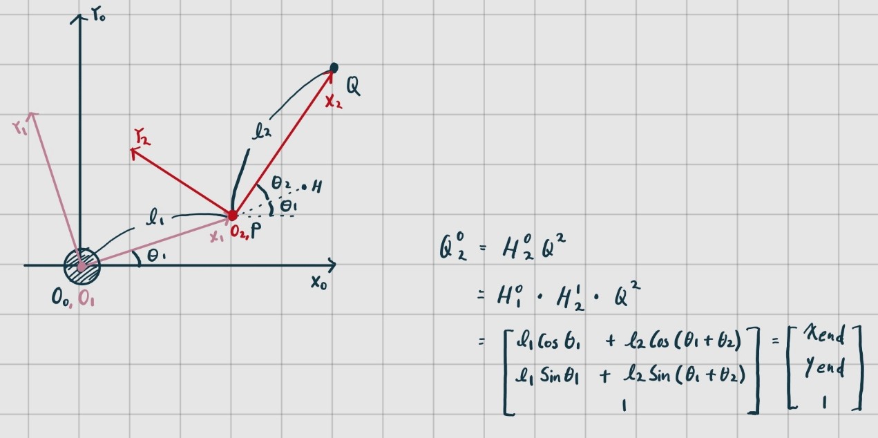이때 각도 과 를 알 때 절대 좌표계를 기준으로 한 의 좌표를 알아내는 것이 Forward Kinematics이고, 절대 좌표계를 기준으로 한 의 좌표를 알 때 각도 과 를 알아내는 것이 Inverse Kinematics이다.