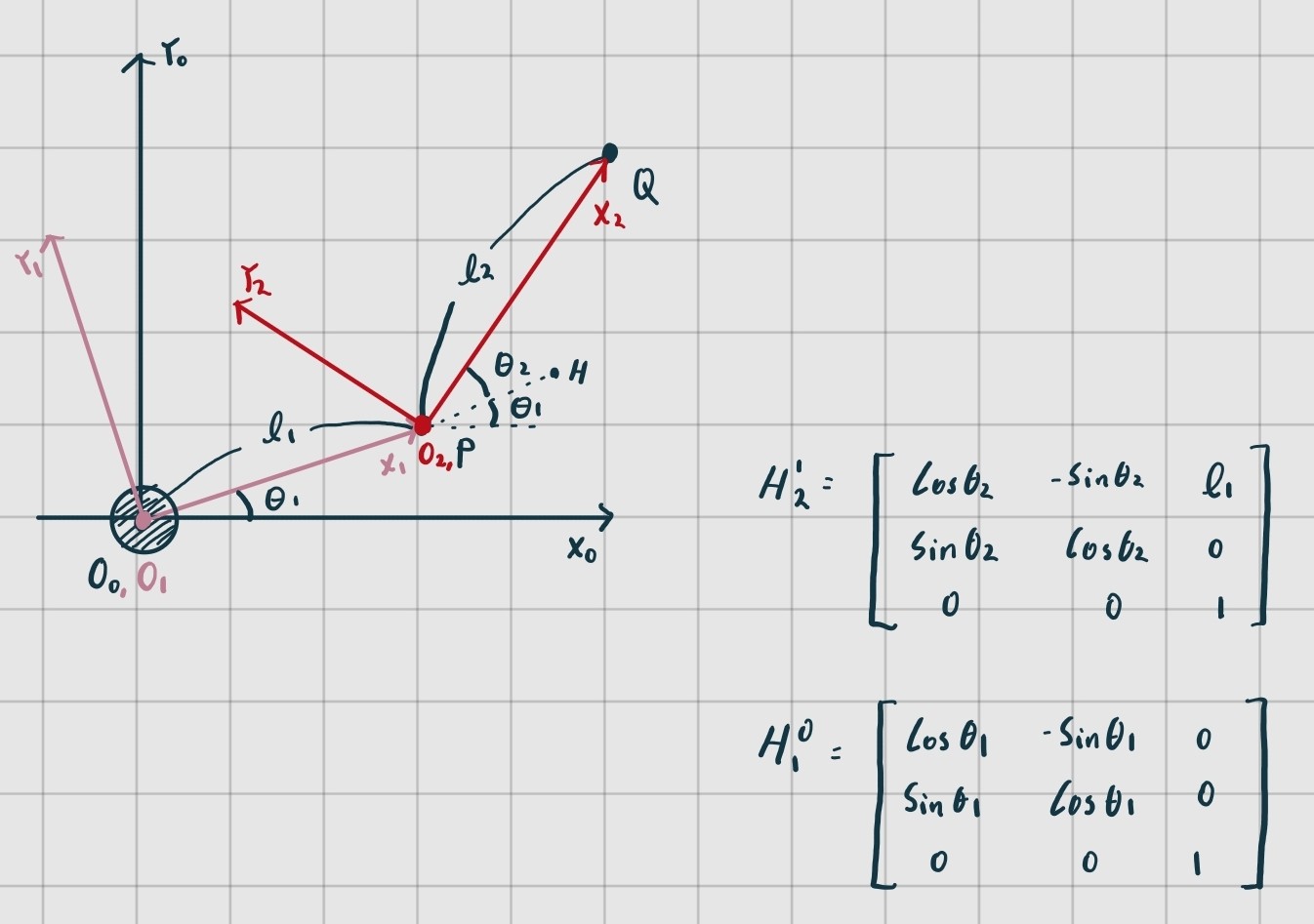 좌표계 1은 좌표계 0에서 rotation했고, 좌표계 2는 좌표계 1에서 translation과 rotation을 했다.