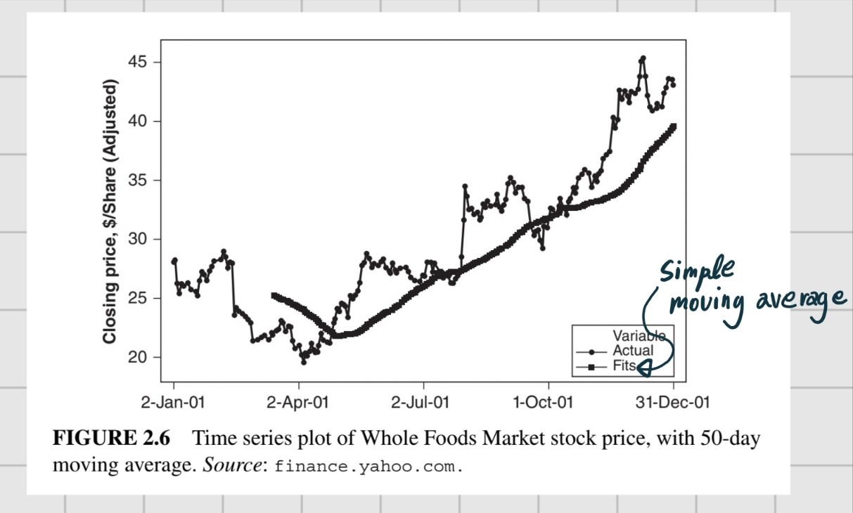때로는 원본 데이터의 smoothed version을 관찰하는 것도 데이터의 양상을 볼 때 도움이 된다. Smoothed version이란 실제 데이터의 그래프가 아니라, 평균이나 중위수 등을 plot한 것을 말한다(smoothing methods는 평균, 중위수 말고도 많다).