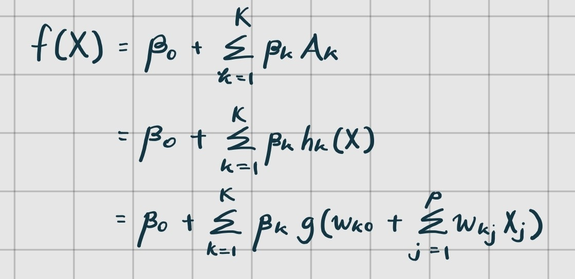 input vector 를 받고(보통 이것을 Input Layer라고 칭한다), 각 들을 Hidden Layer의 노드로 하나씩 보낸다. 그런 다음 hidden layer의 각 노드에서 activation fuction을 통과시키면 각 노드 들만의 값이 계산되는데, 이 값들의 결합이 가 되는 것이다. 수식으로 표현하면 아래와 같다.