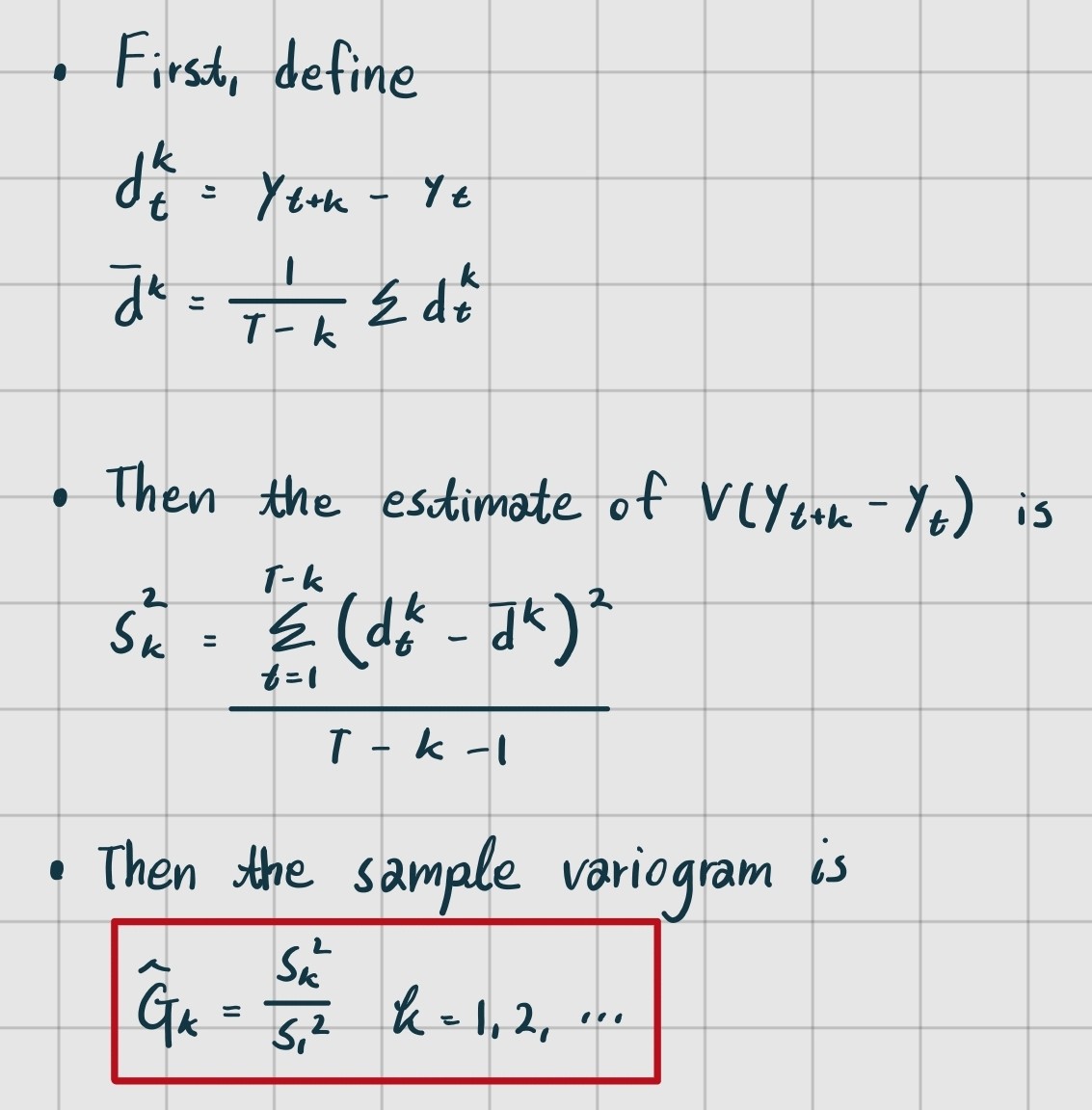 시계열 데이터가 stationary한지 알기 위해서는 plot을 그려 해당 데이터의 경향을 볼 수도 있고, sample ACF의 plot을 그려 0으로 수렴하는지 볼 수도 있다. 이에 더해 stationary한지를 유추할 수 있는 방법이 하나 더 있는데, 바로 Variogram이다.