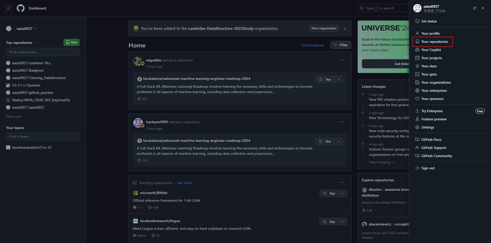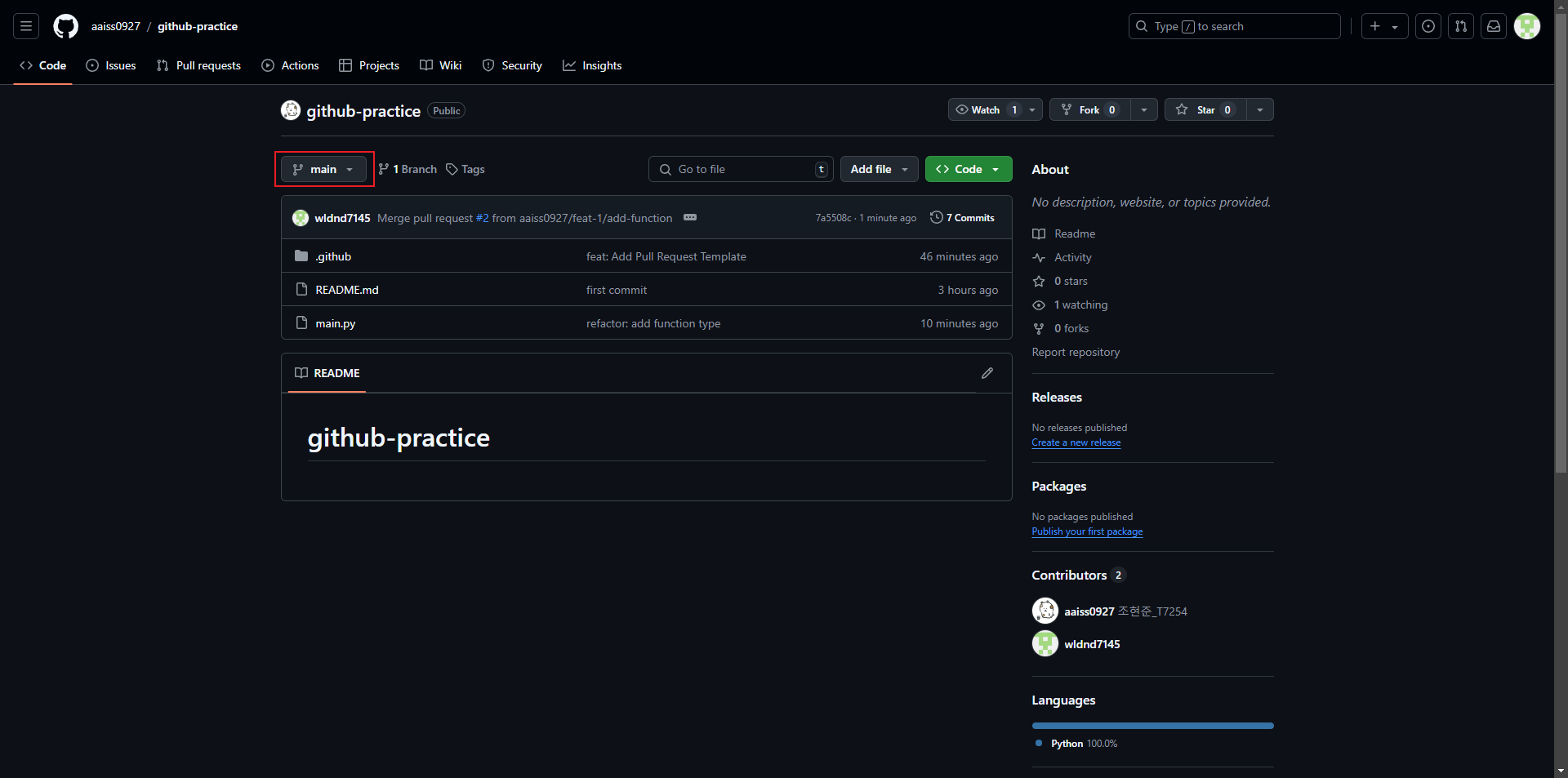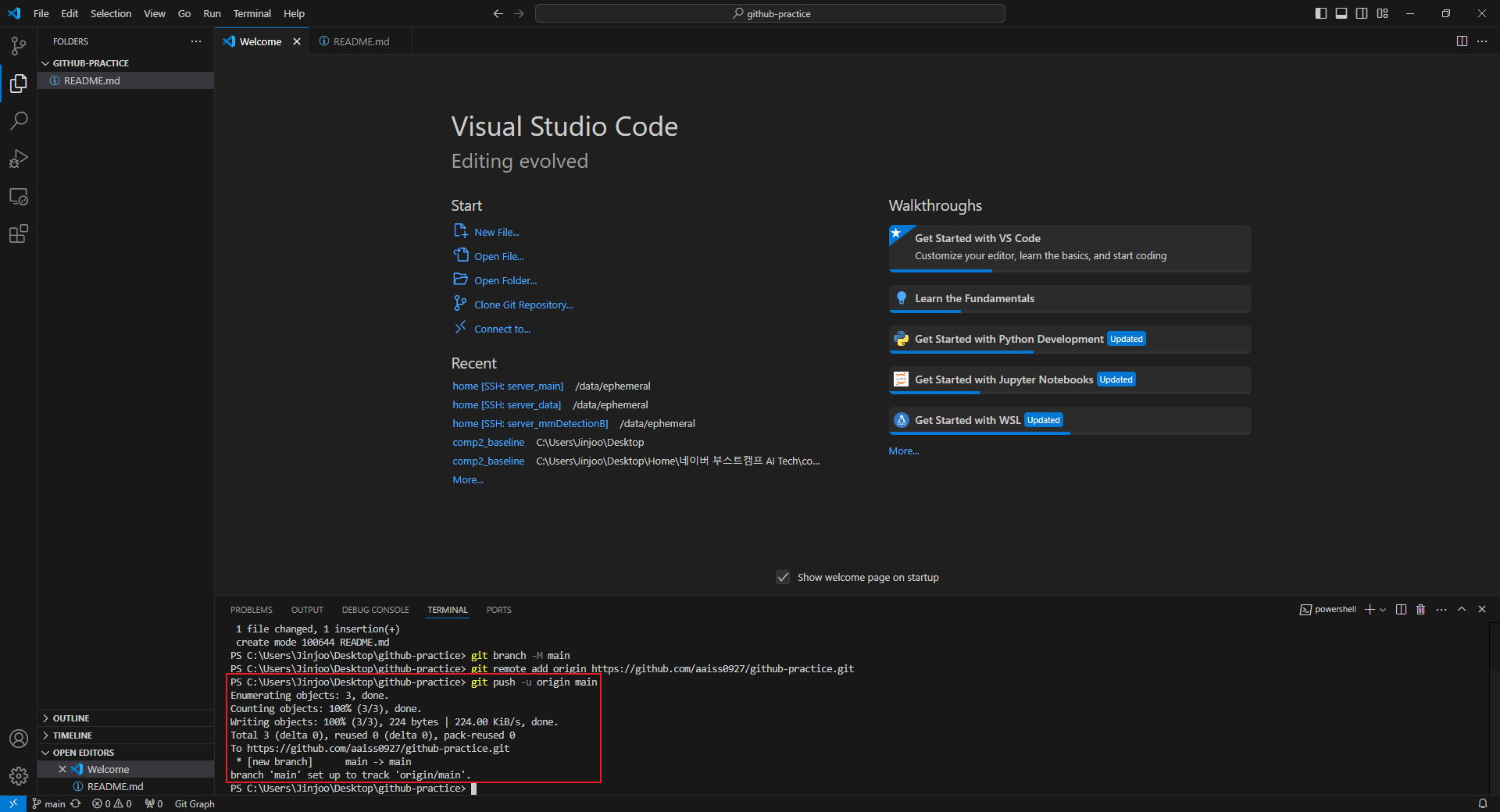 git push -u origin main : origin -> main push 자동화 (이후 git push만 써도 됨)