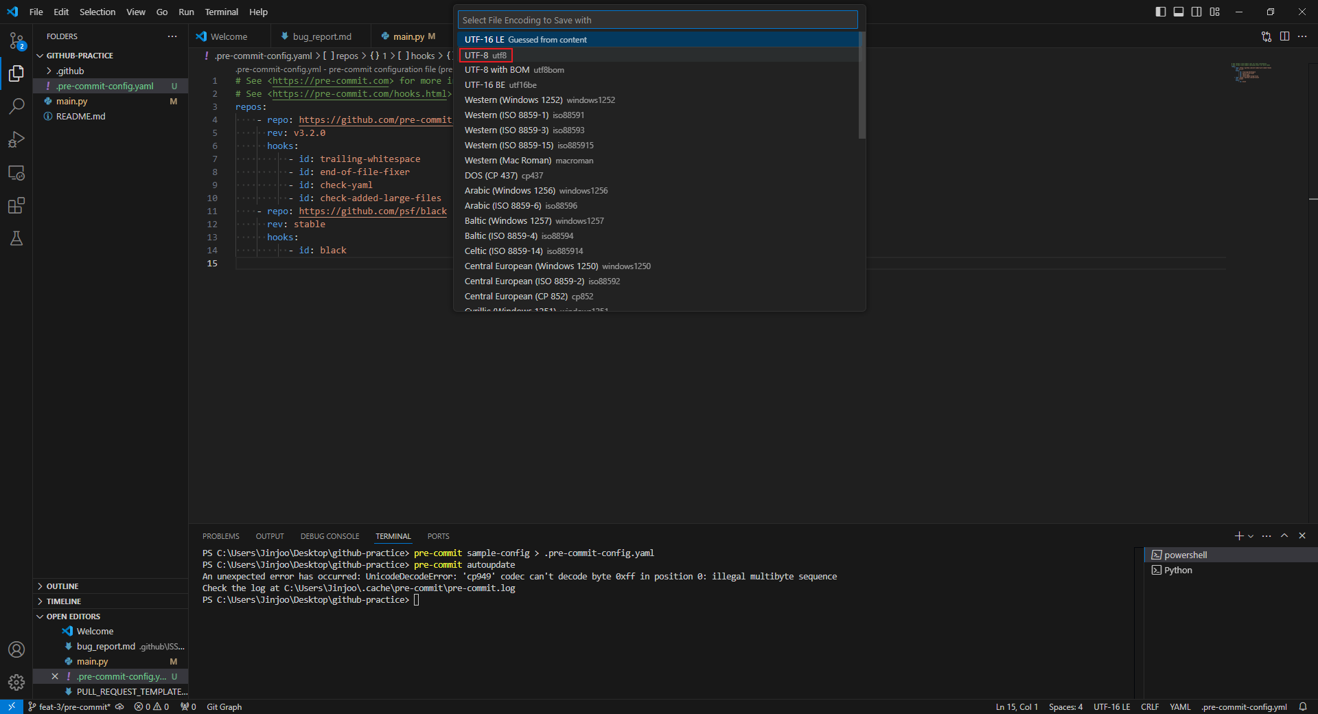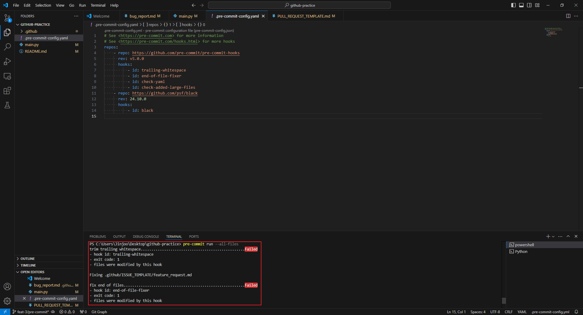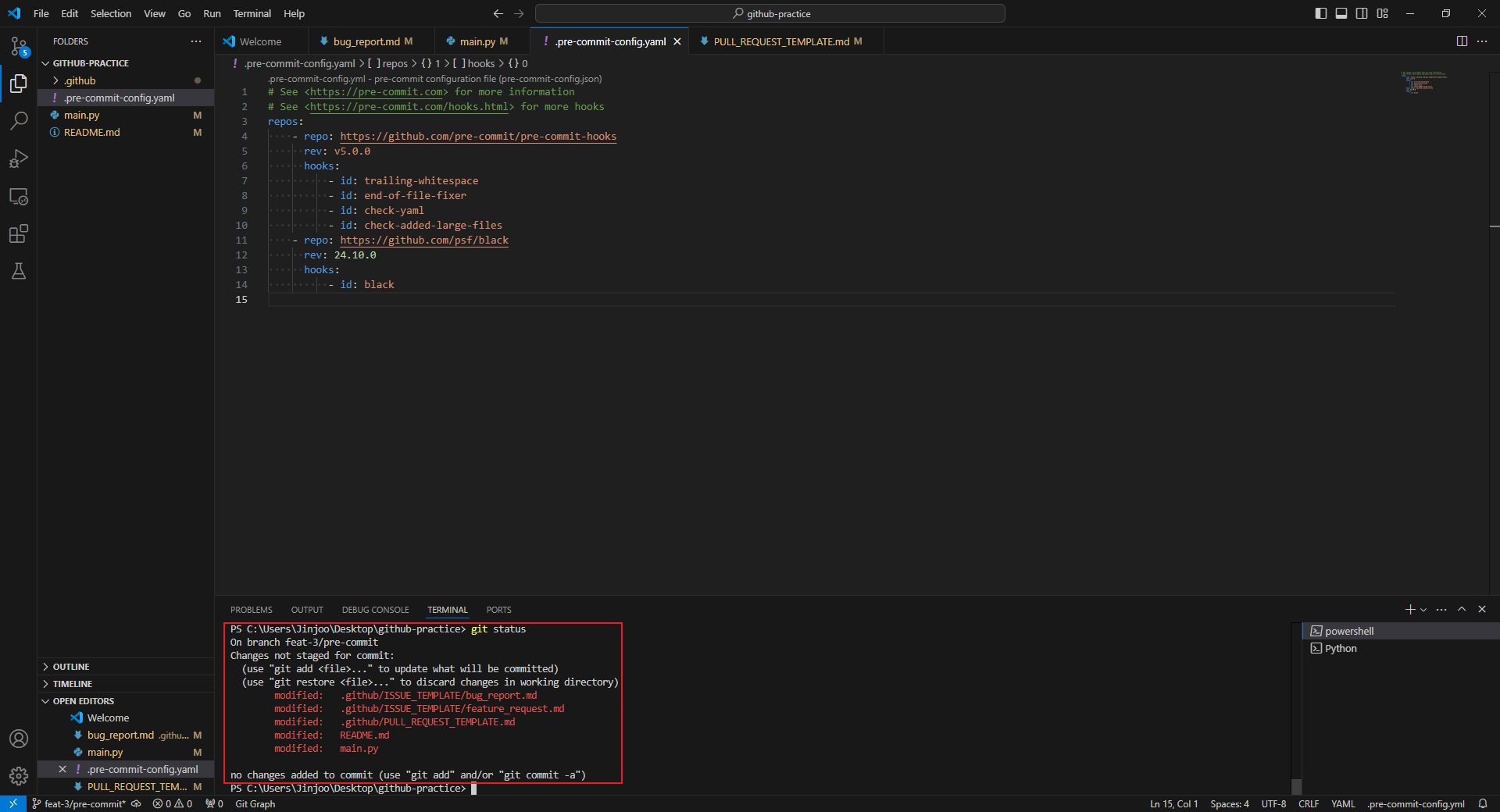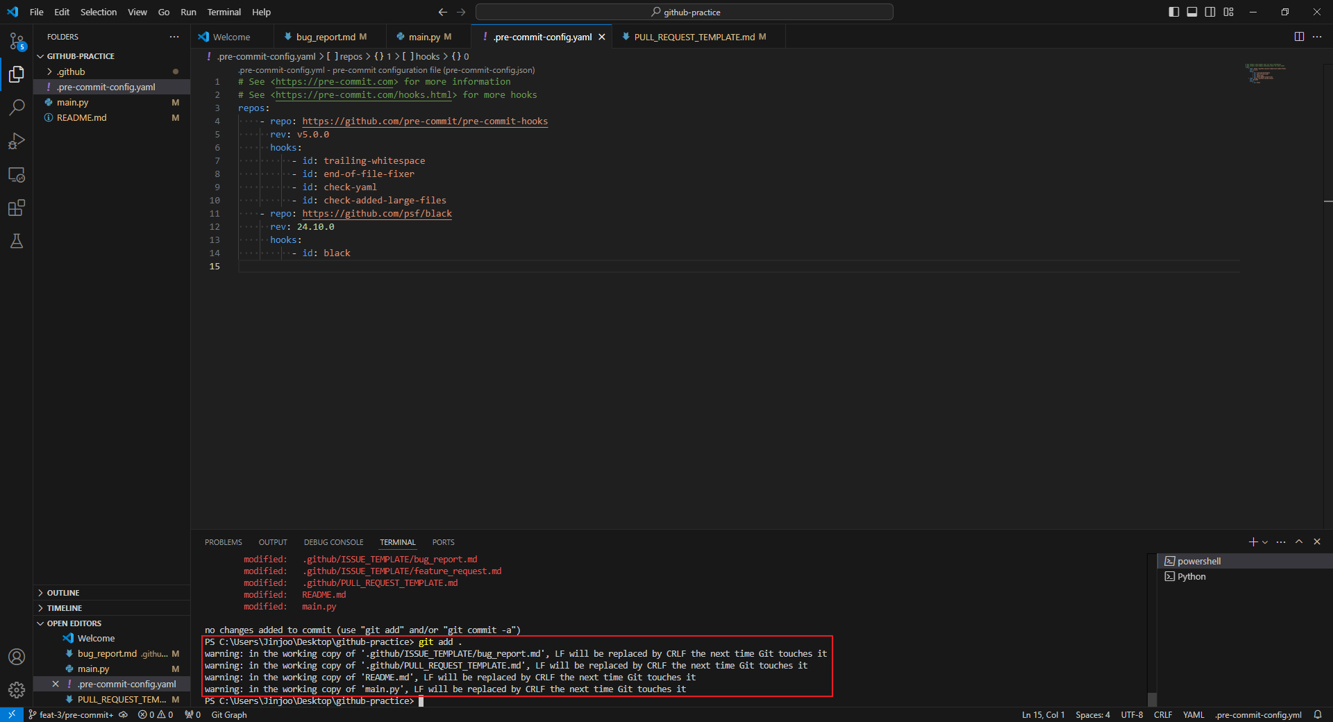 git reset HEAD^ : 최신 commit 취소pip install pre-commit : pre-commit 라이브러리 설치