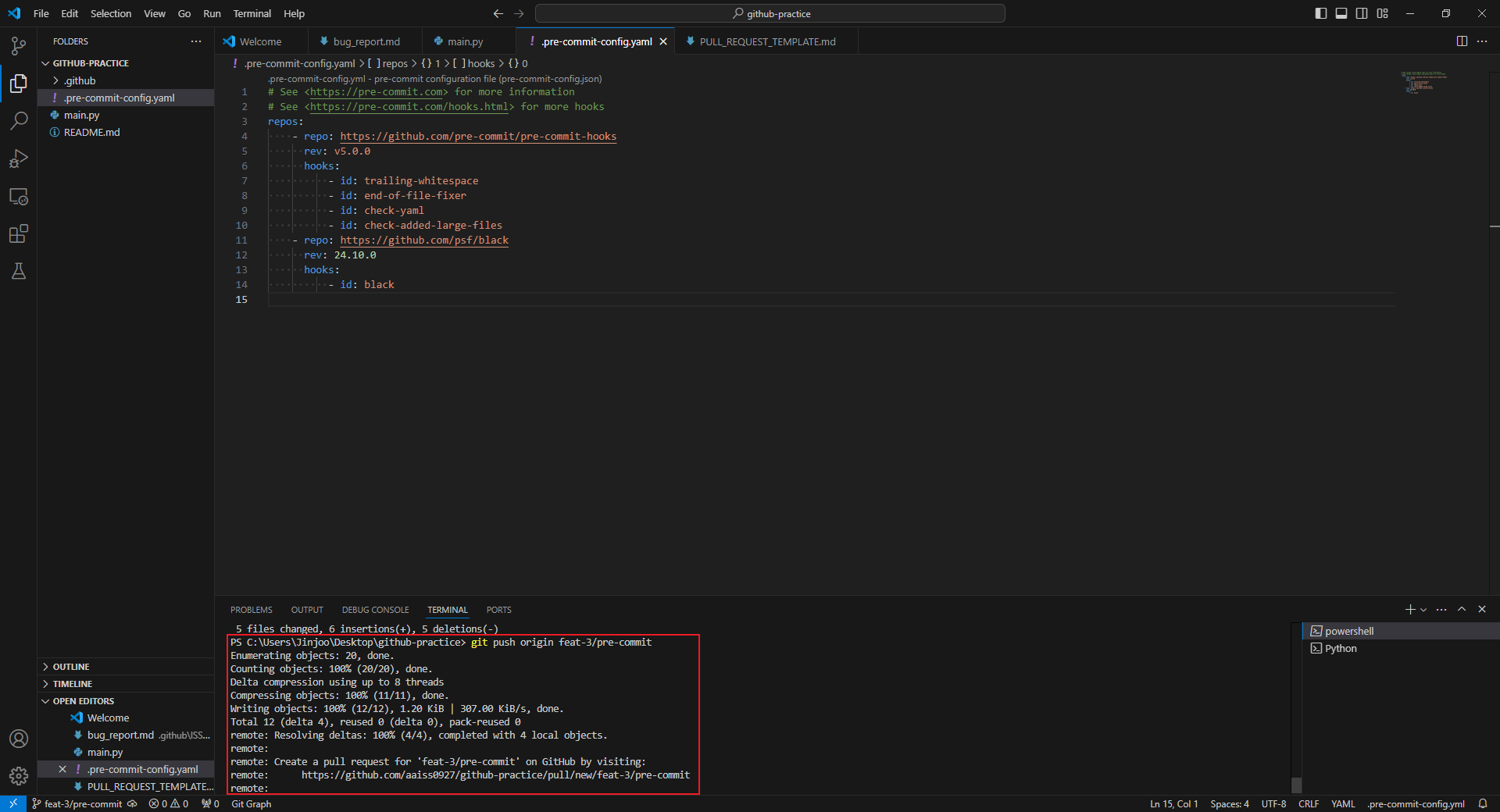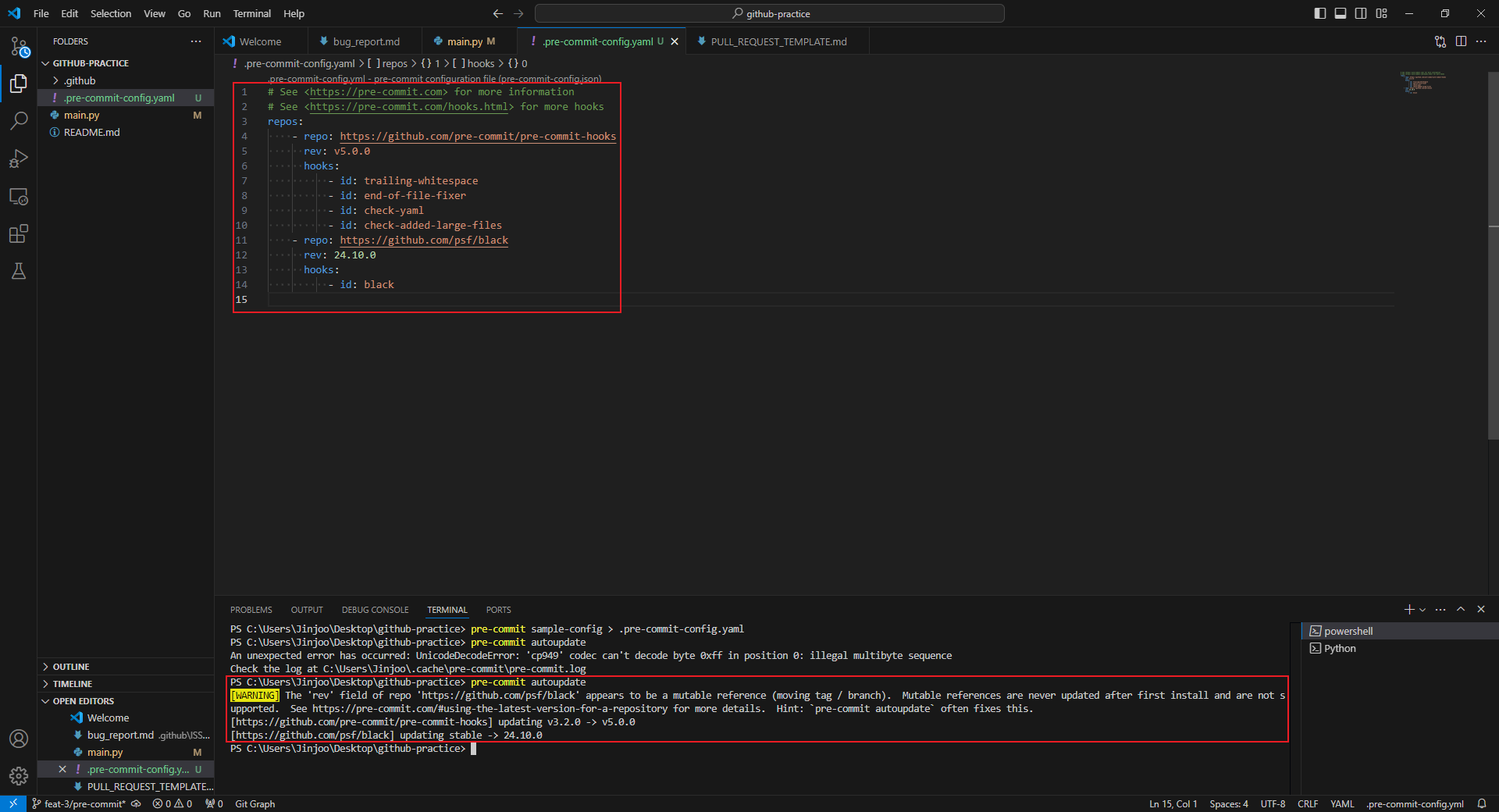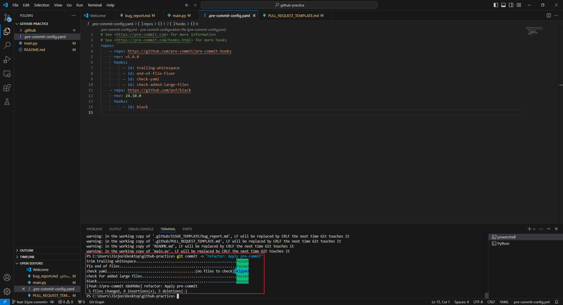 git reset HEAD^ : 최신 commit 취소pip install pre-commit : pre-commit 라이브러리 설치