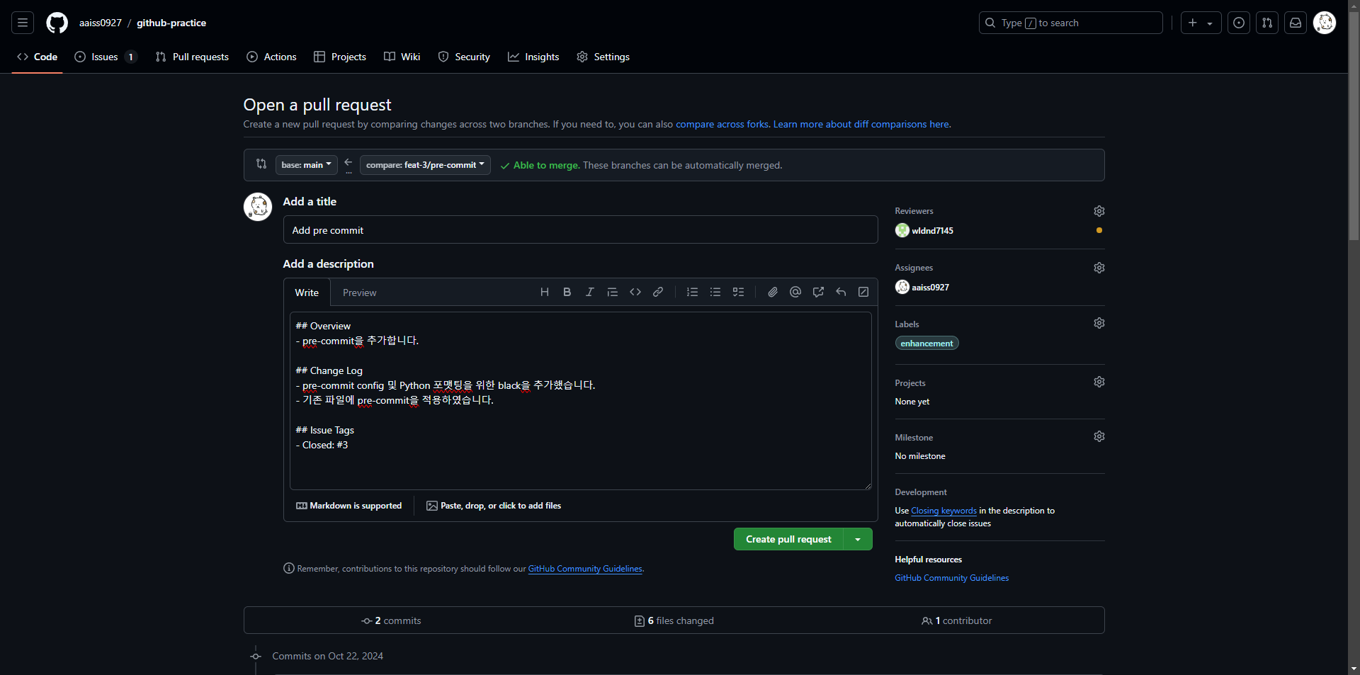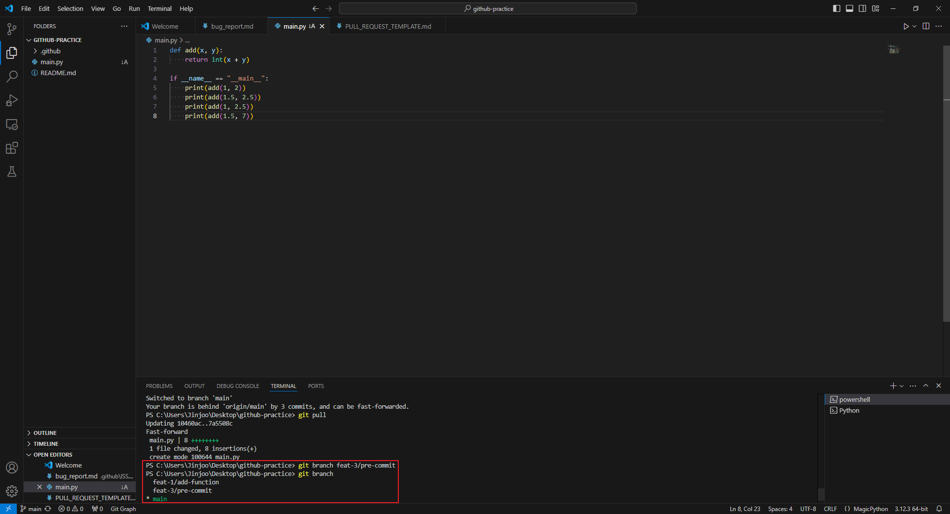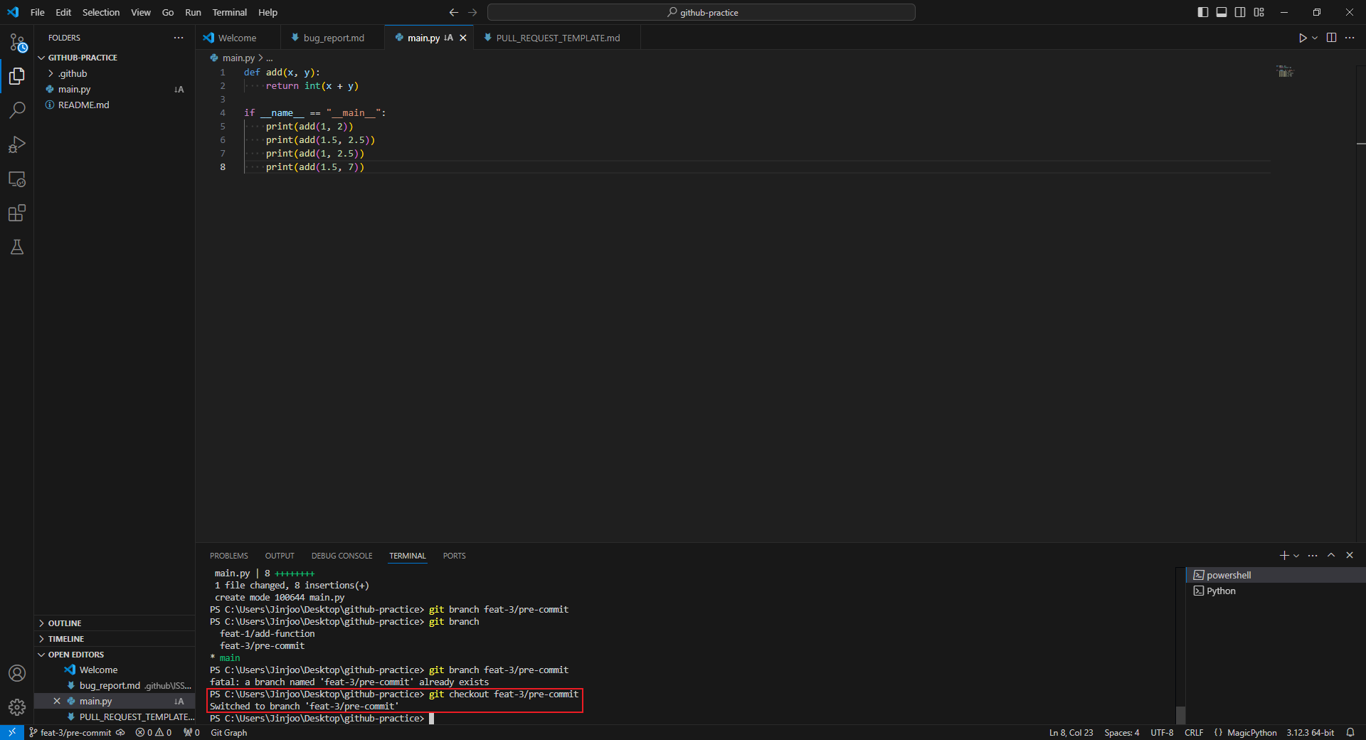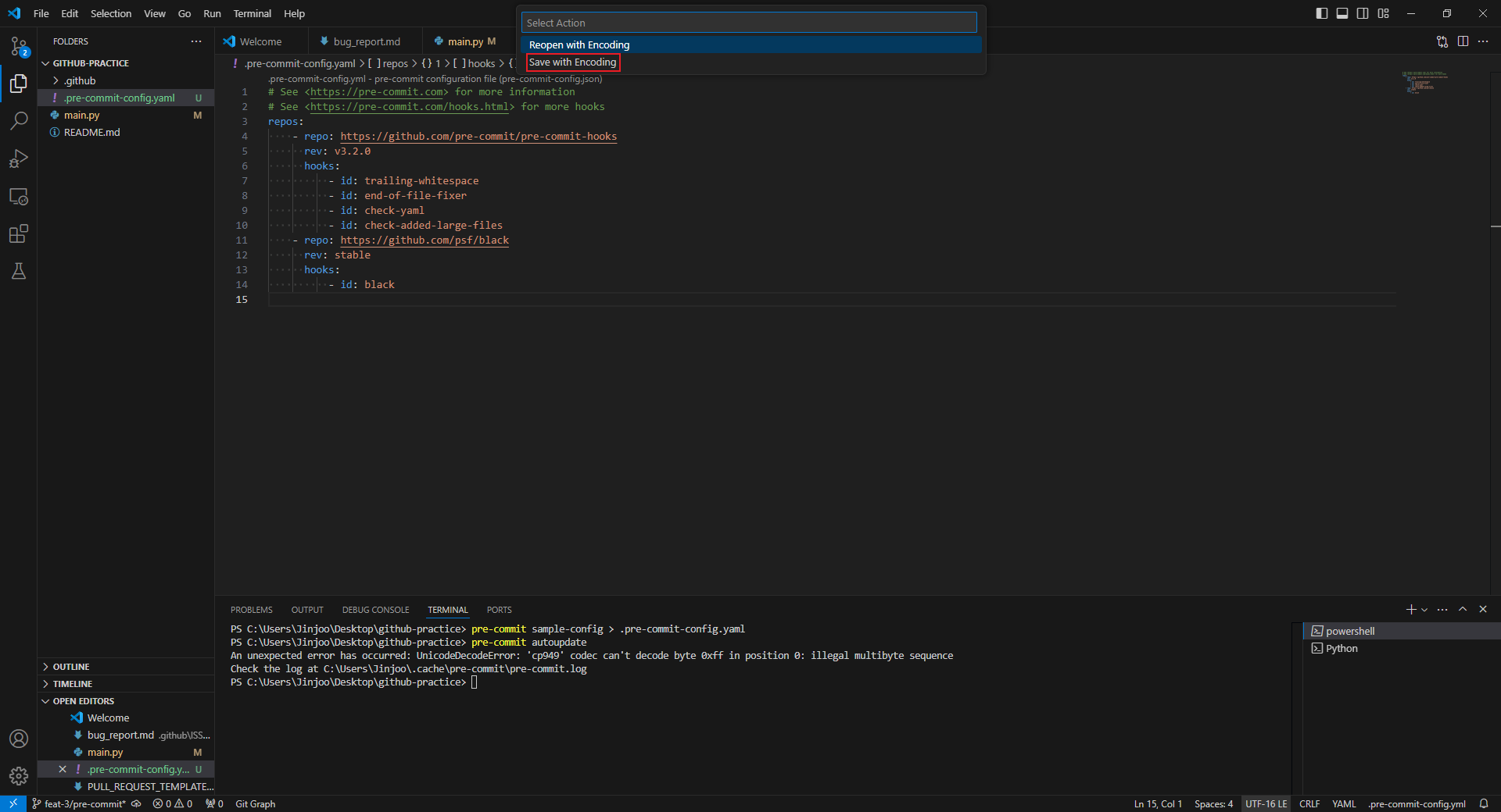 git reset HEAD^ : 최신 commit 취소pip install pre-commit : pre-commit 라이브러리 설치