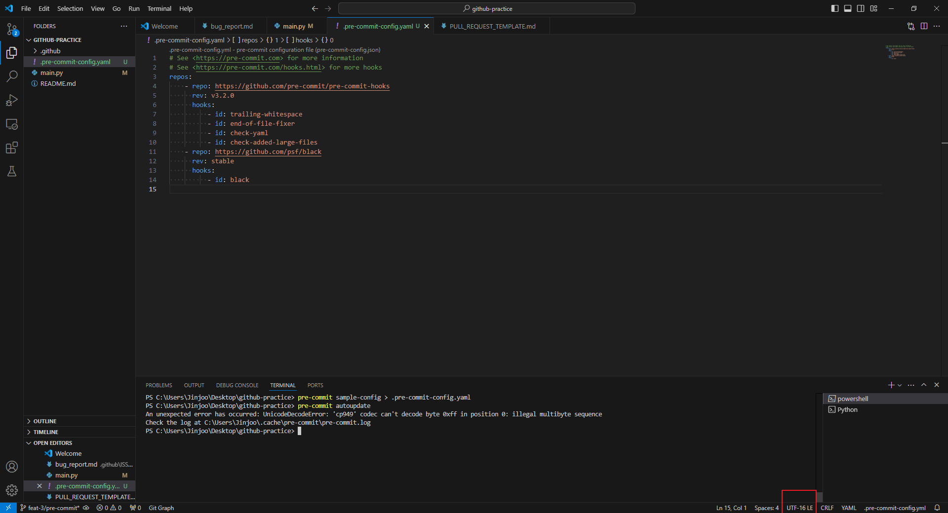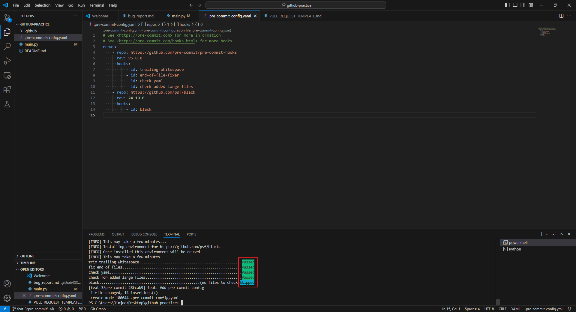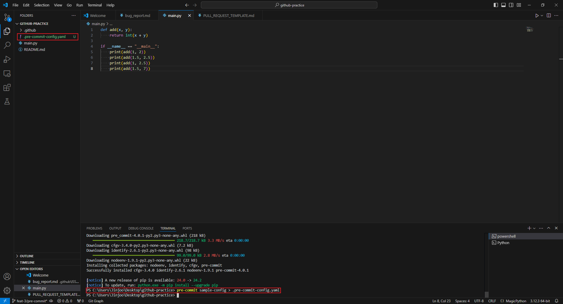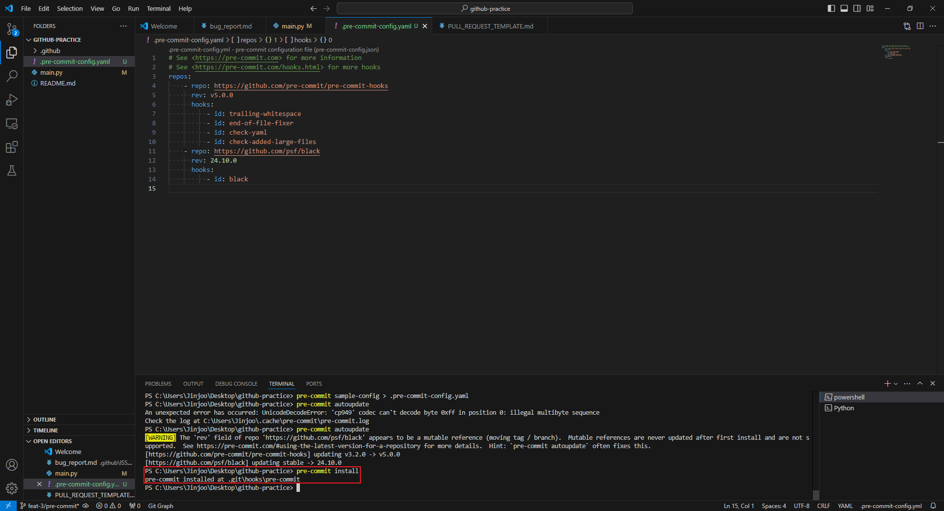 pre-commit install : 현재 branch에 pre-commit config 적용