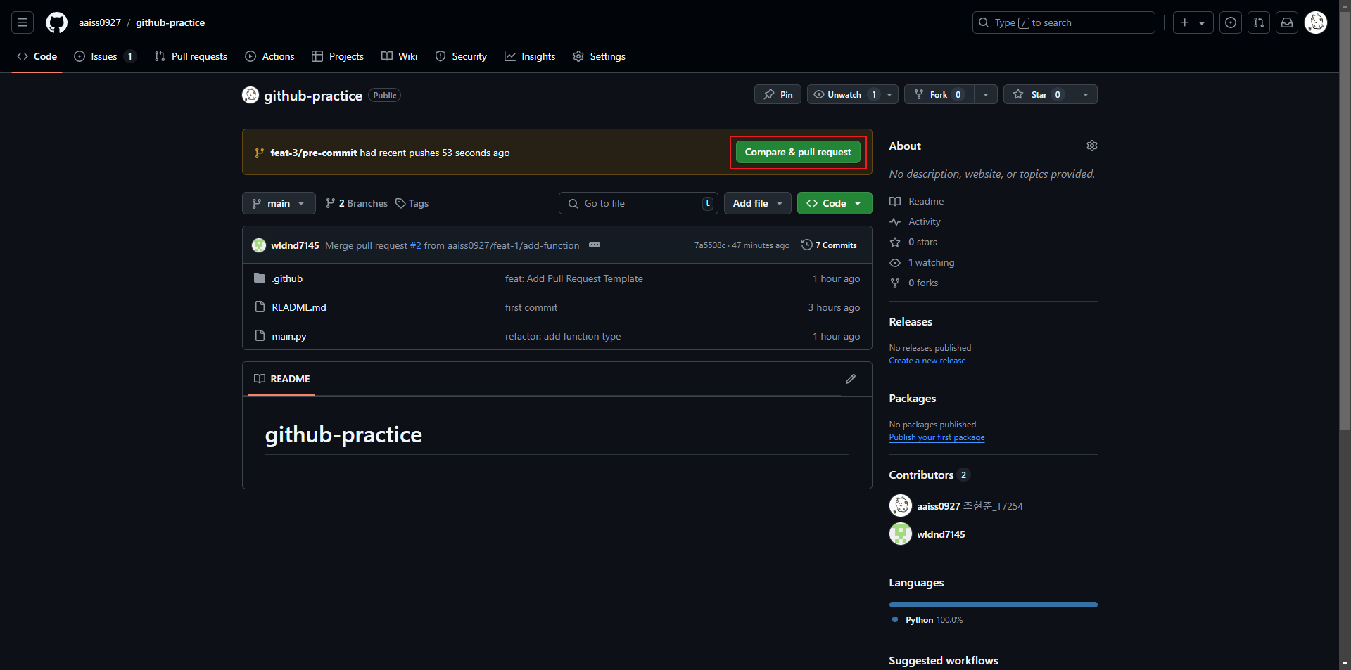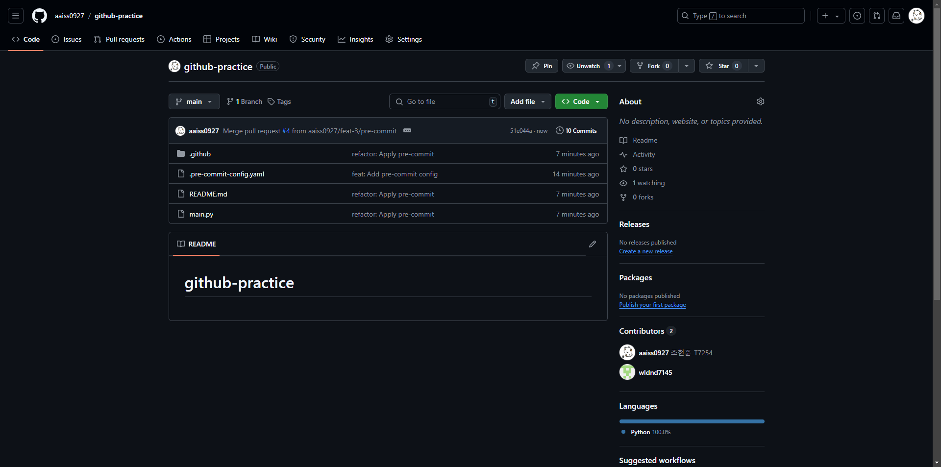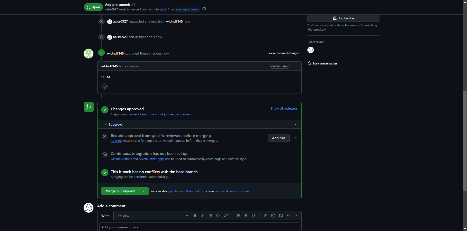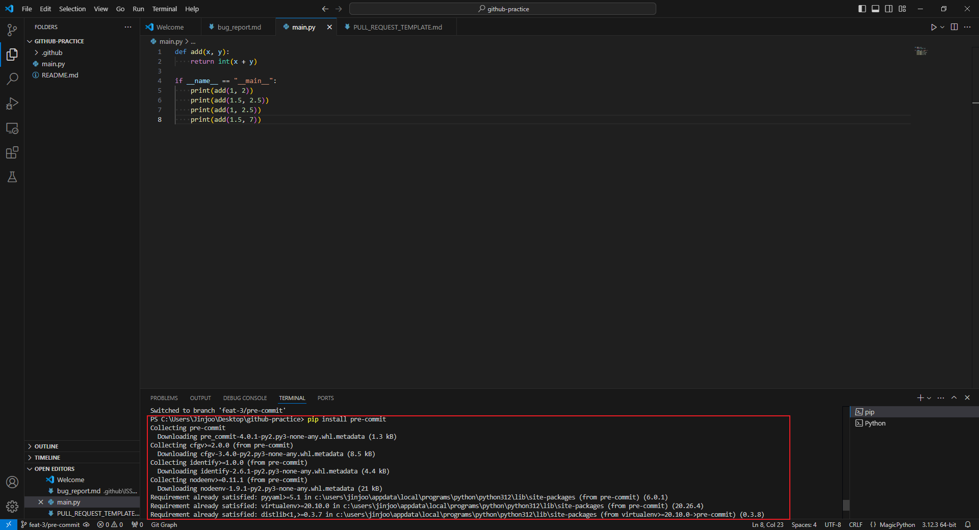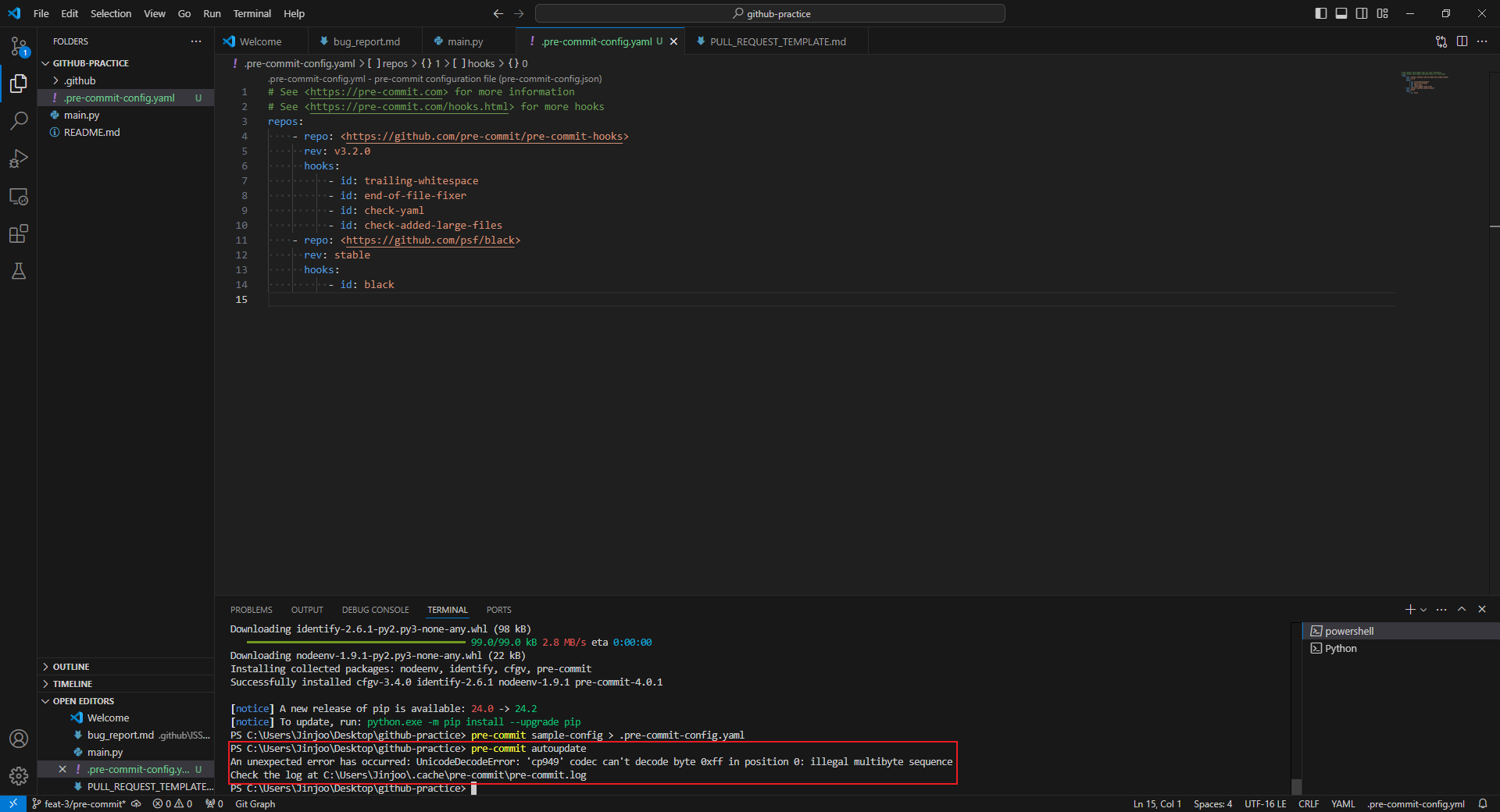 pre-commit install : 현재 branch에 pre-commit config 적용