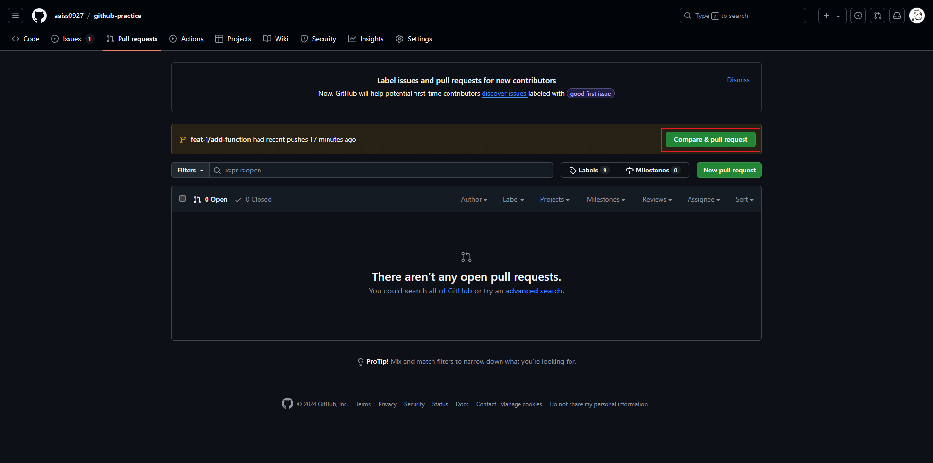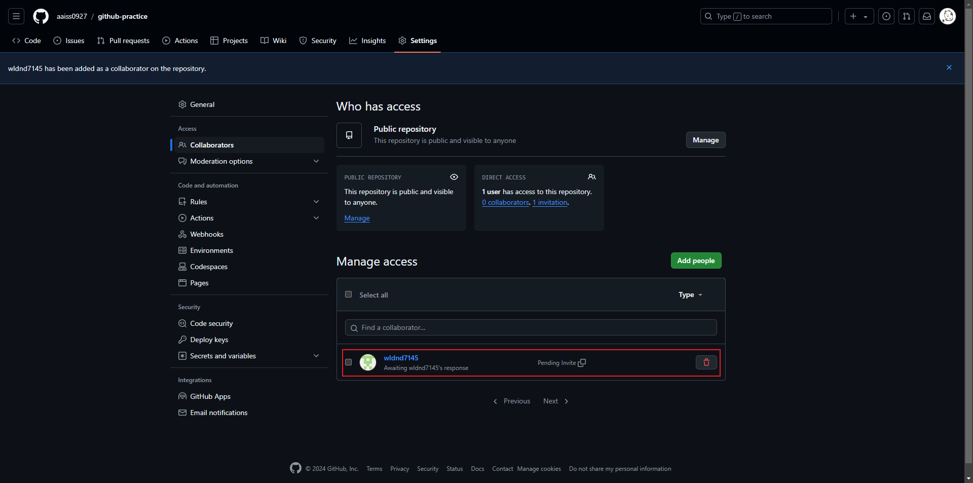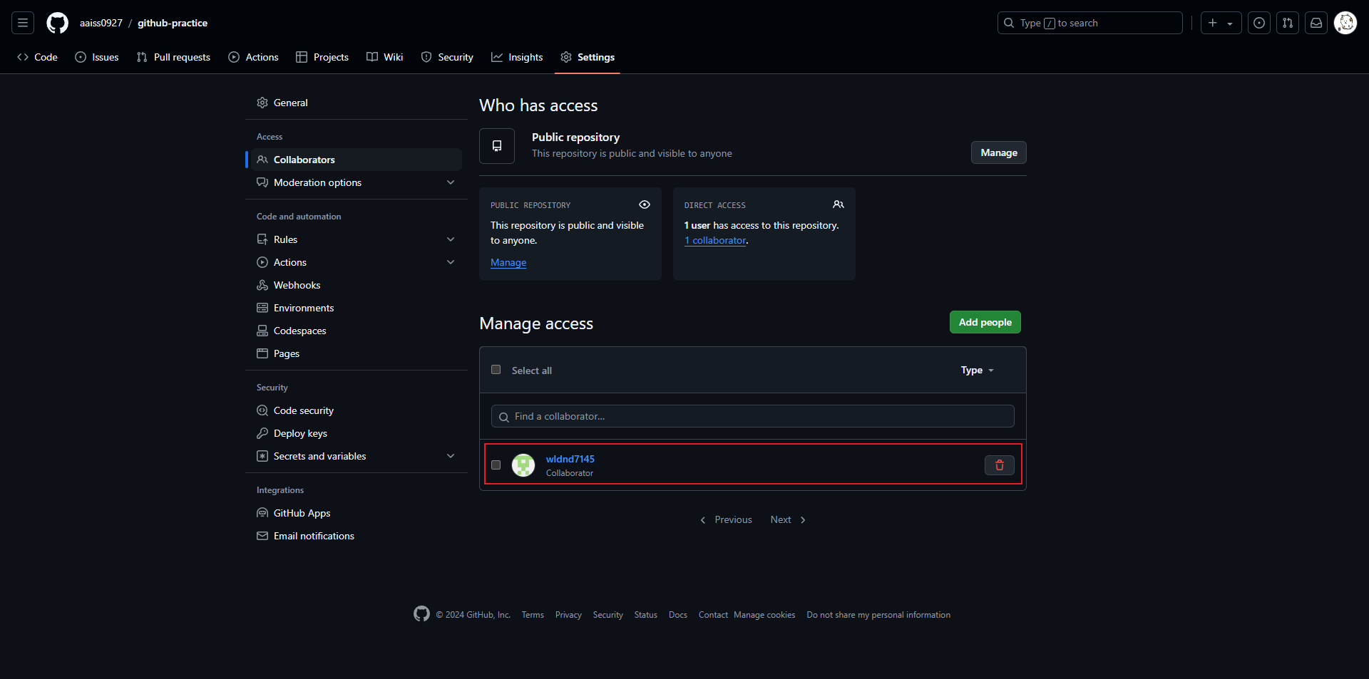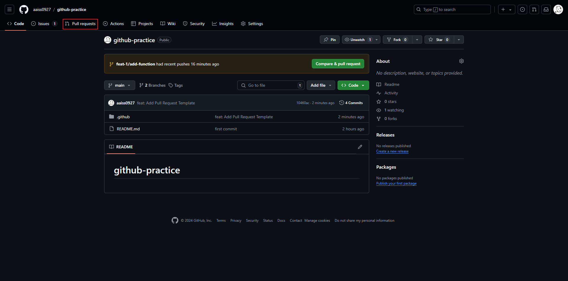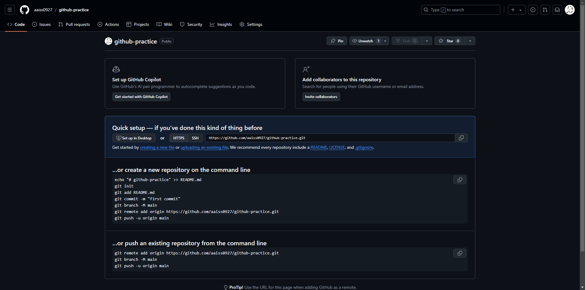 "Repository name"(github-practice) 작성 후 "Create repository" 클릭