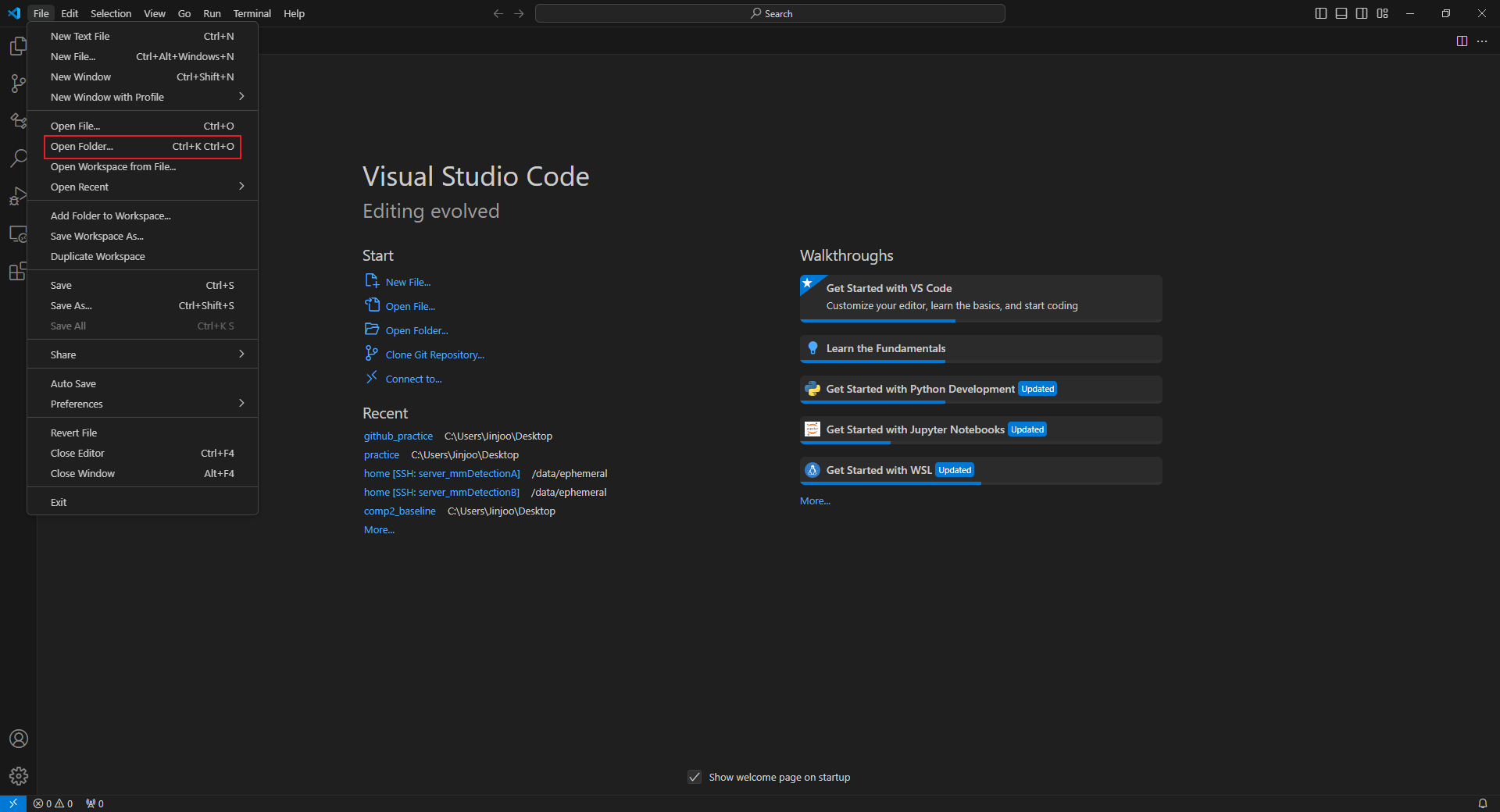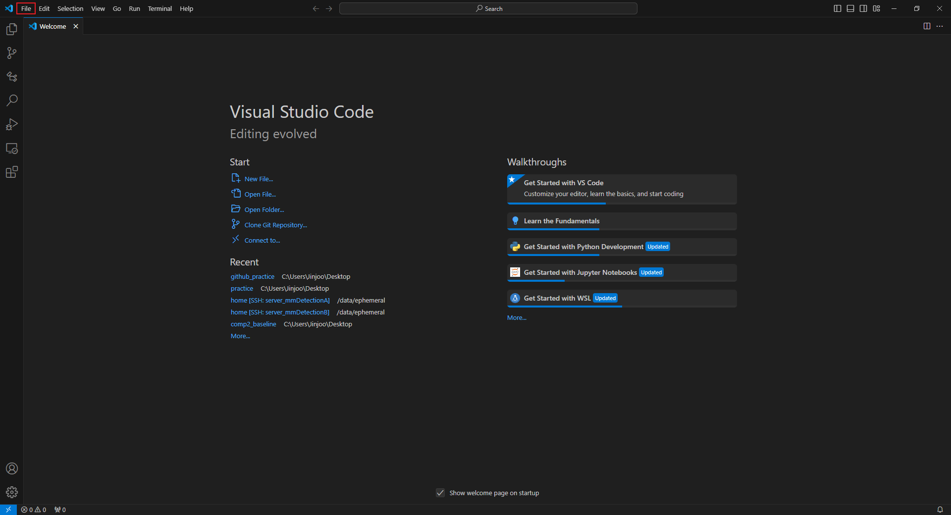 새로 열린 VSCode 창에서 좌측 상단 "File" 클릭
