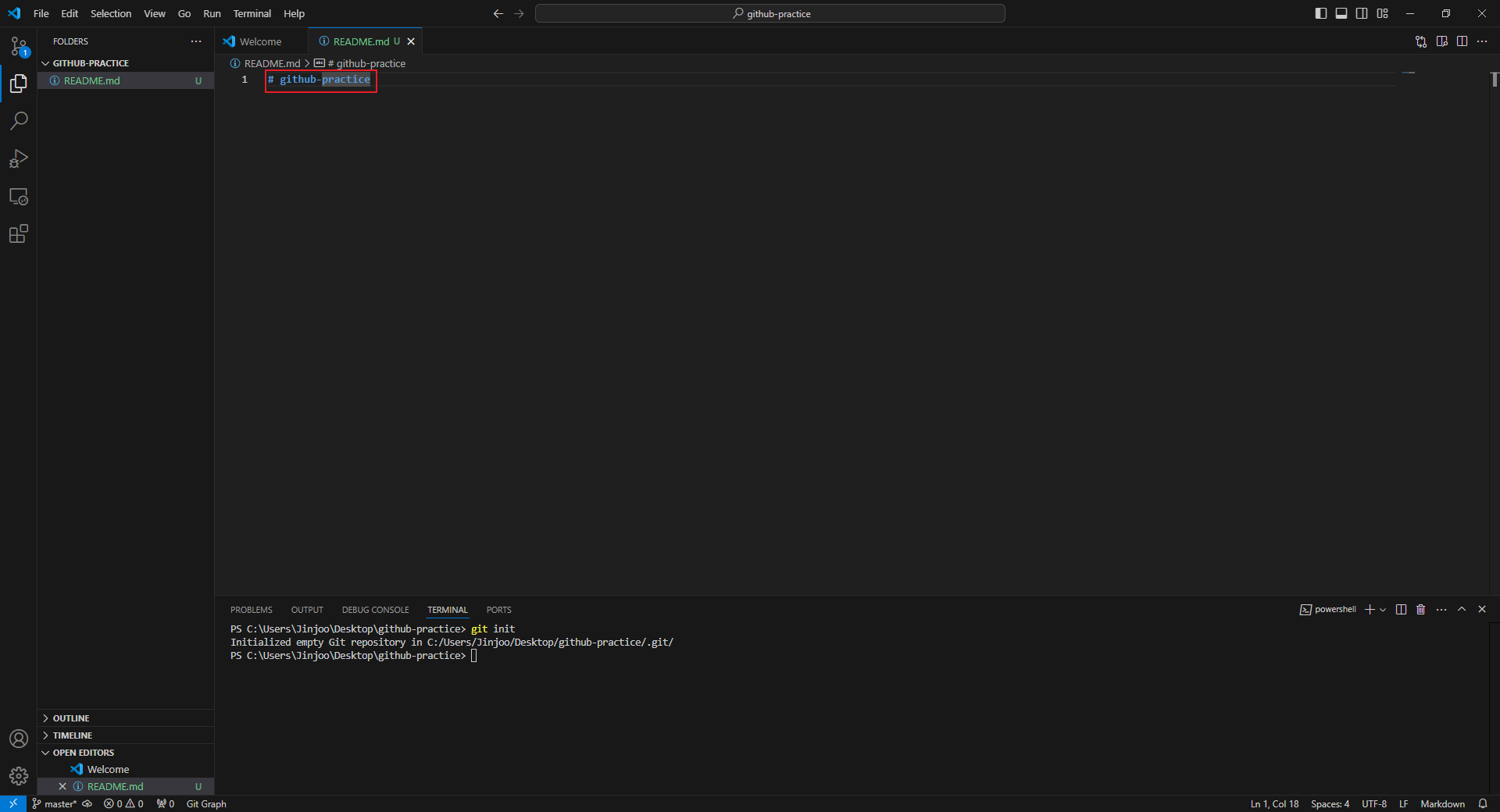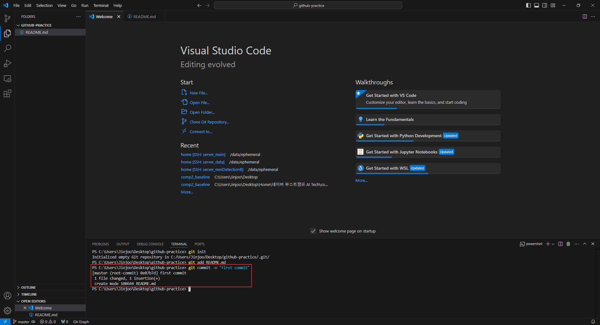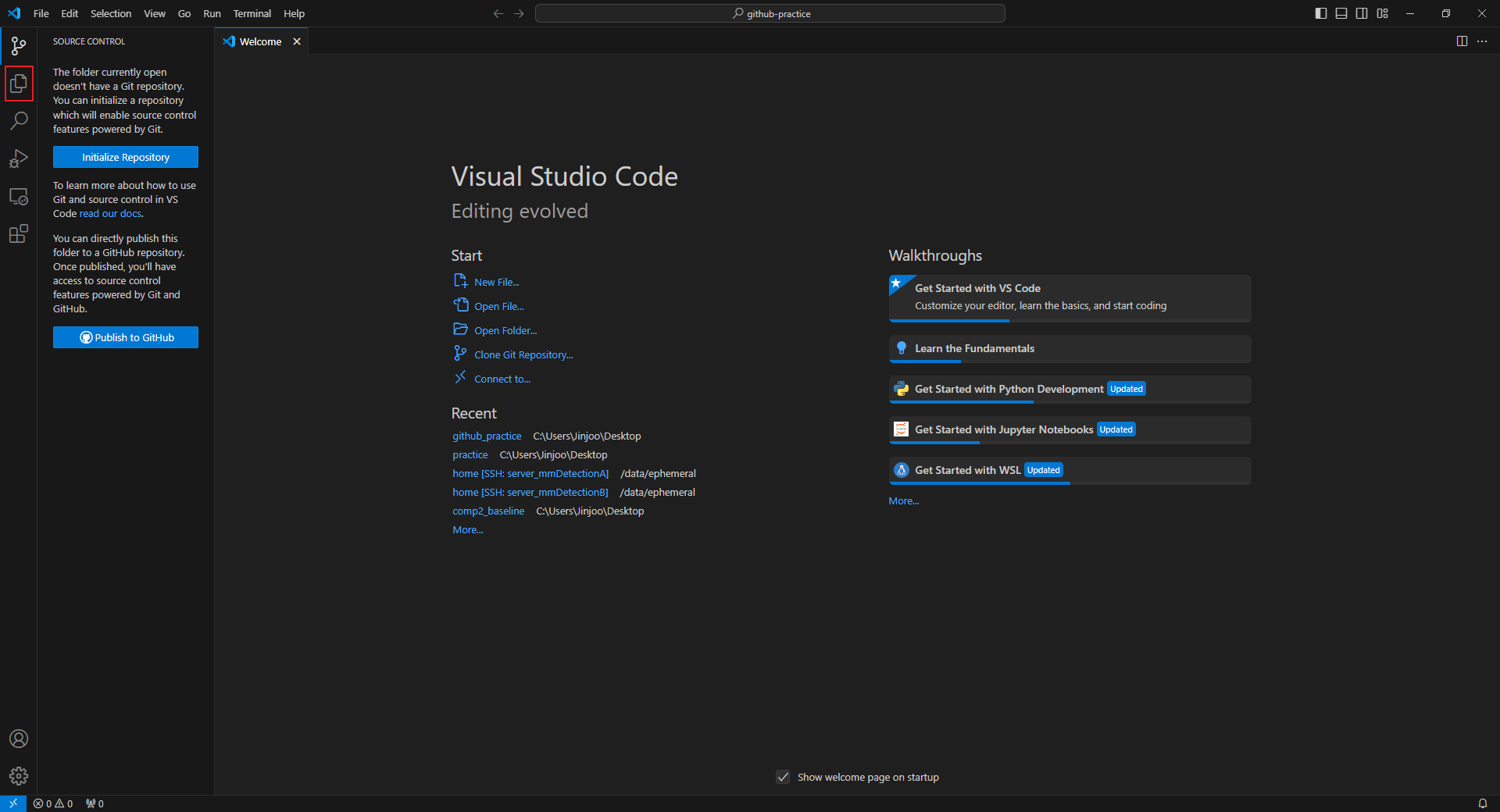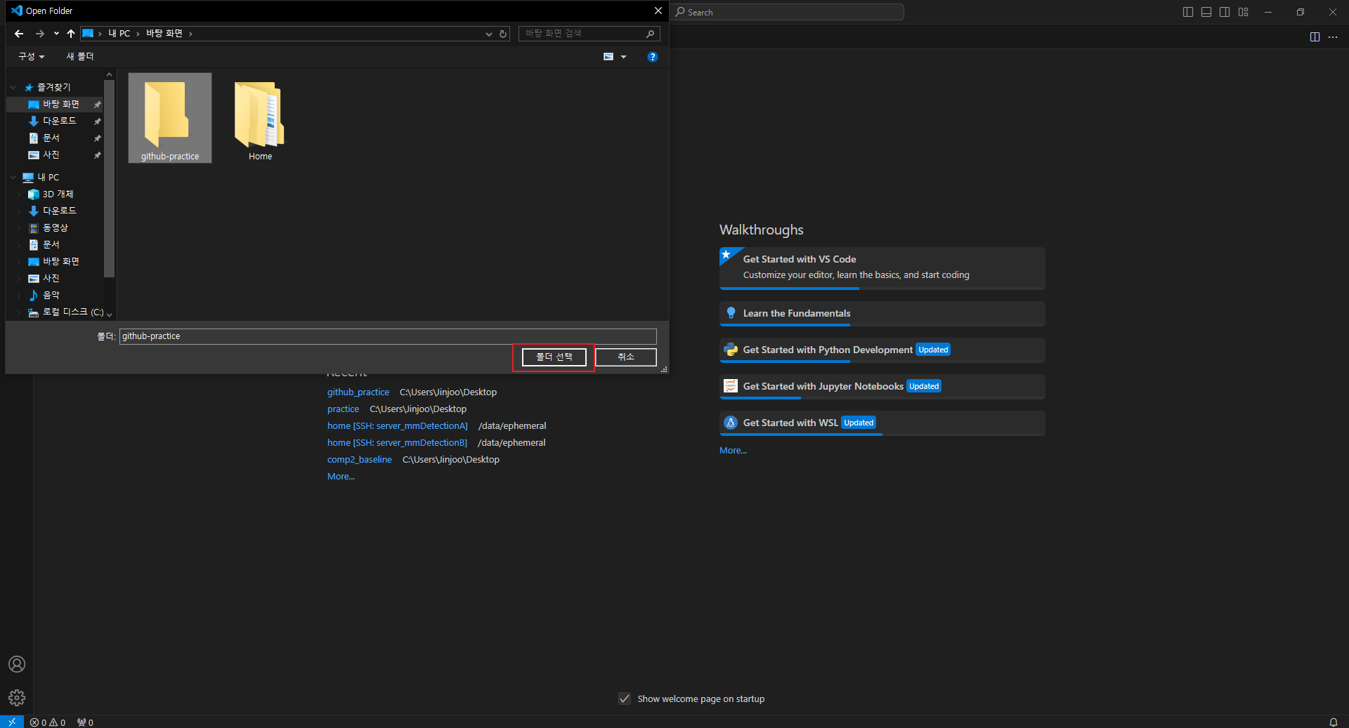 바탕 화면에서 "github-practice" 클릭 후 "폴더 선택" 클릭