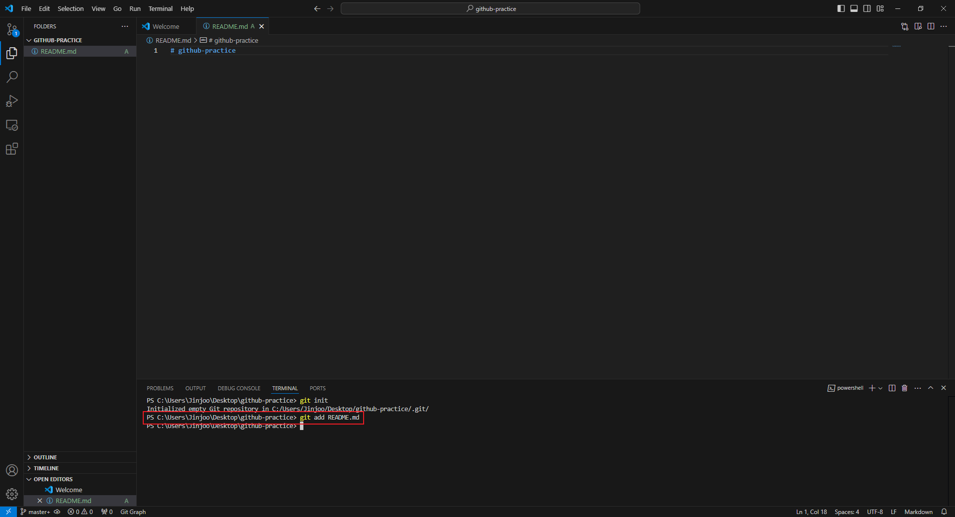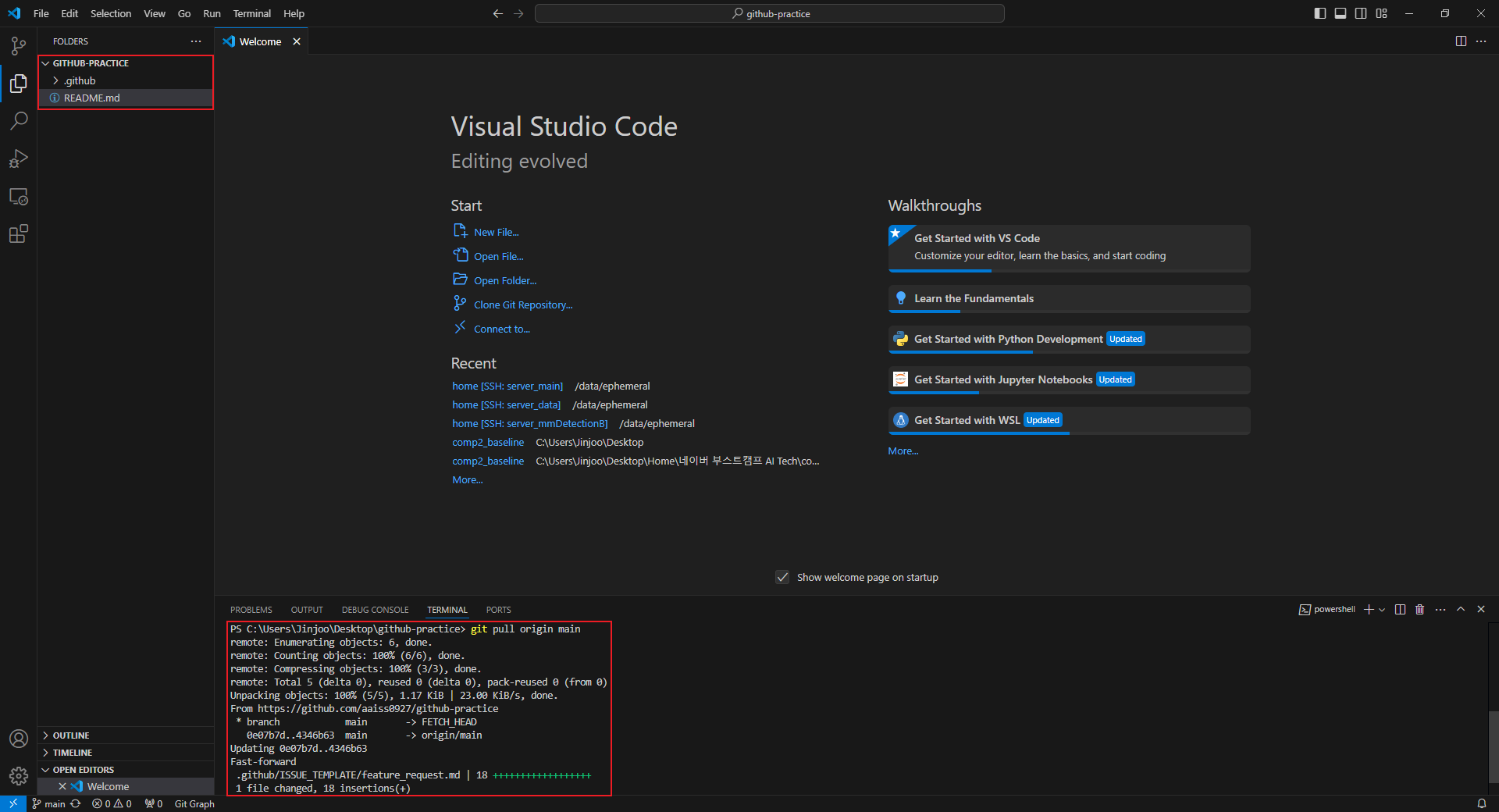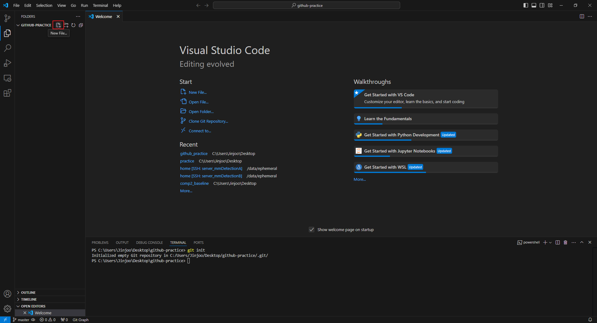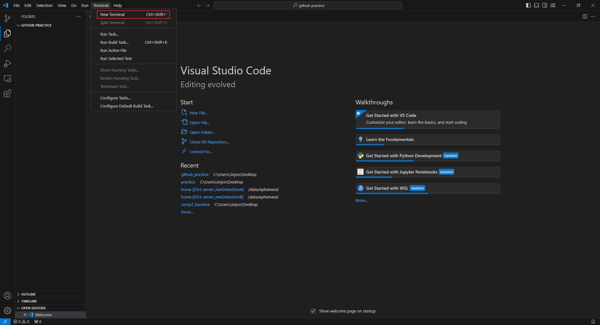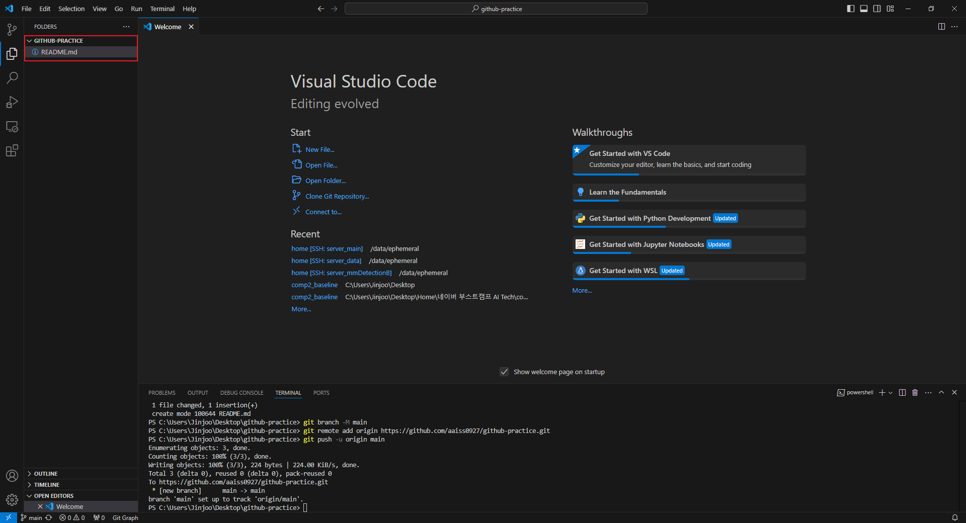 바탕 화면에서 "github-practice" 클릭 후 "폴더 선택" 클릭