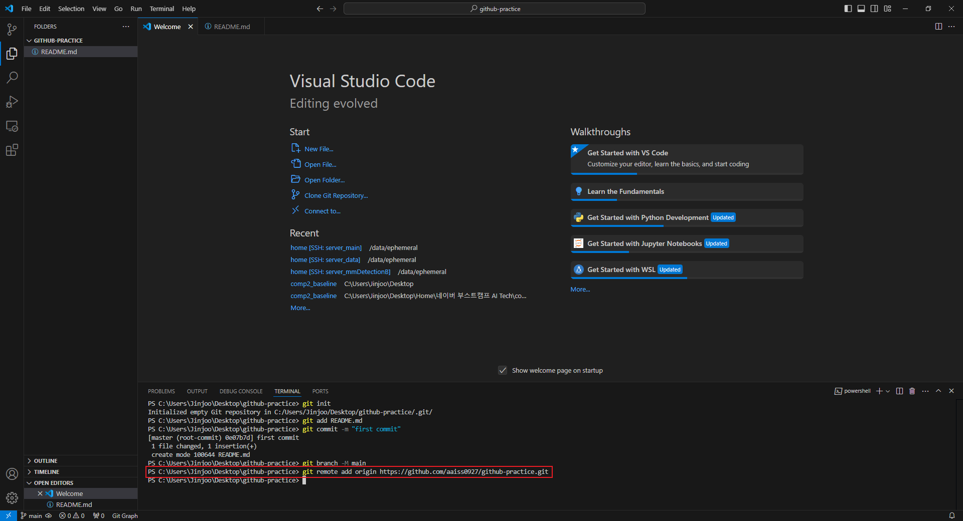 git remote <git 경로> : origin remote 폴더 만들고 git 경로와 연동git branch -M main : main 브랜치로 이동
