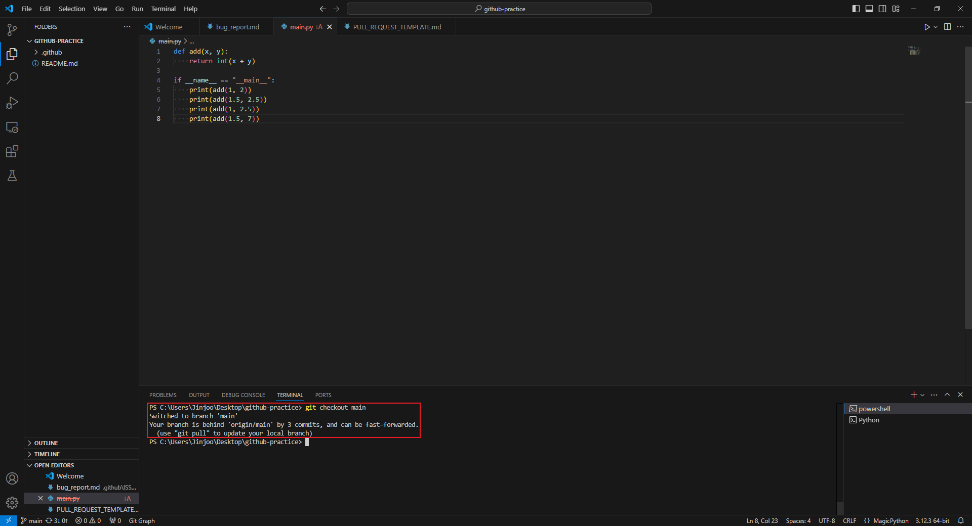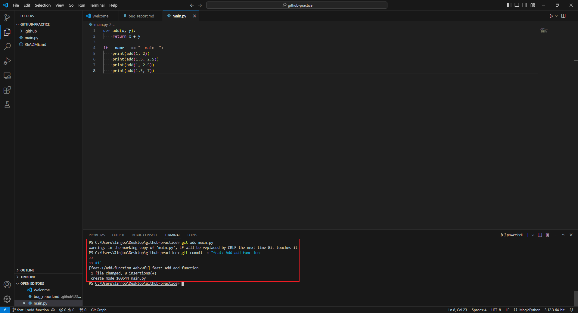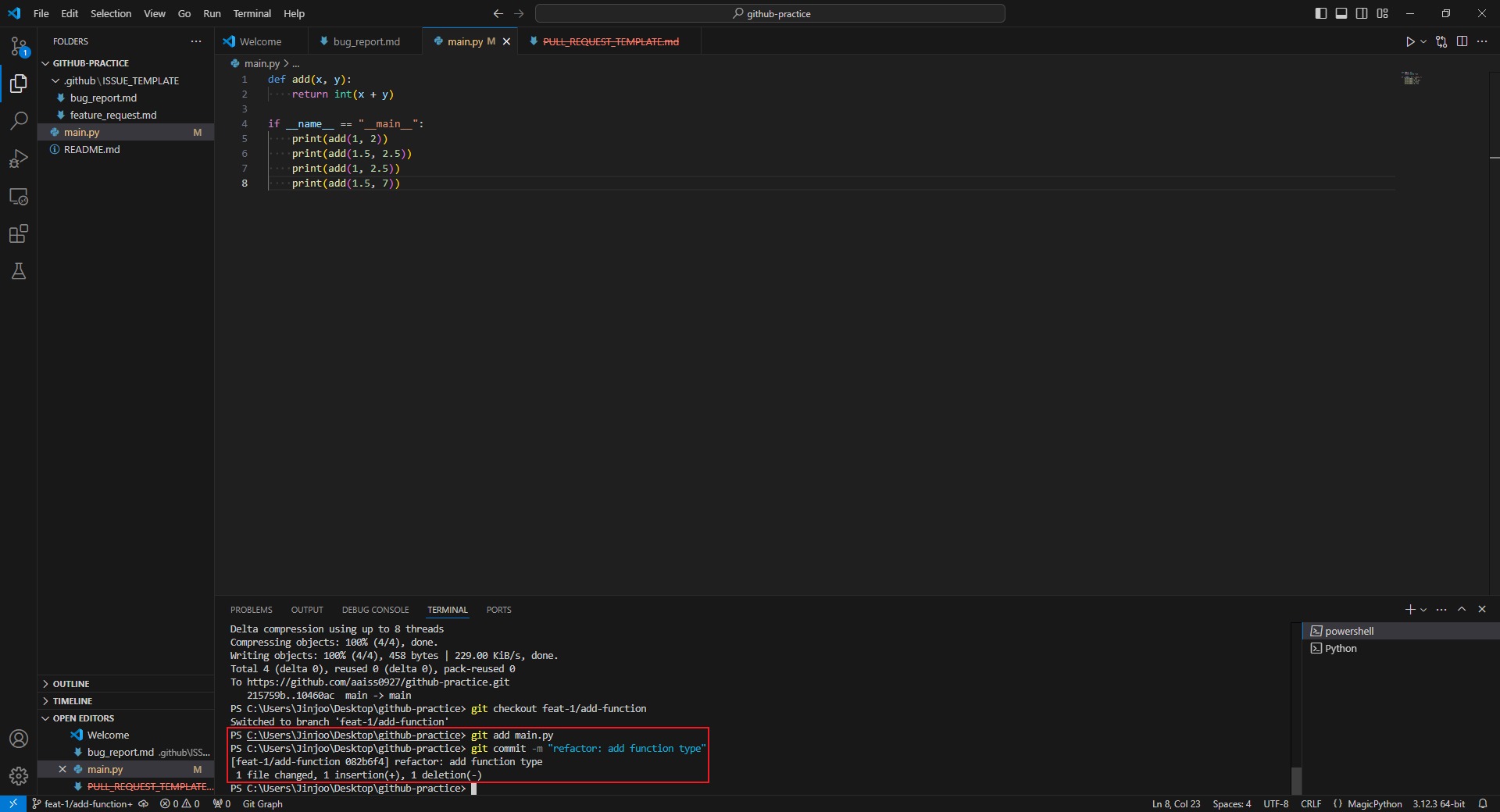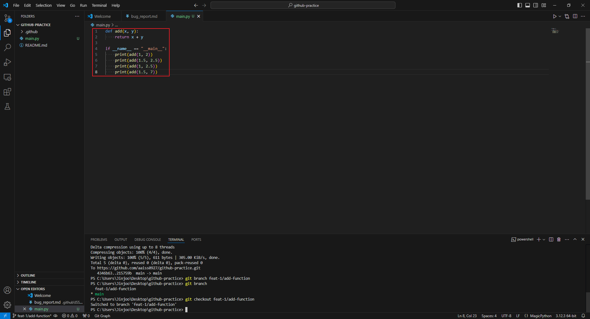 git checkout -b <branch_x> : branch_x로 이동, branch_x가 없다면 생성 후 이동git add <abc.py> : 현재 브랜치에 abc.py stage