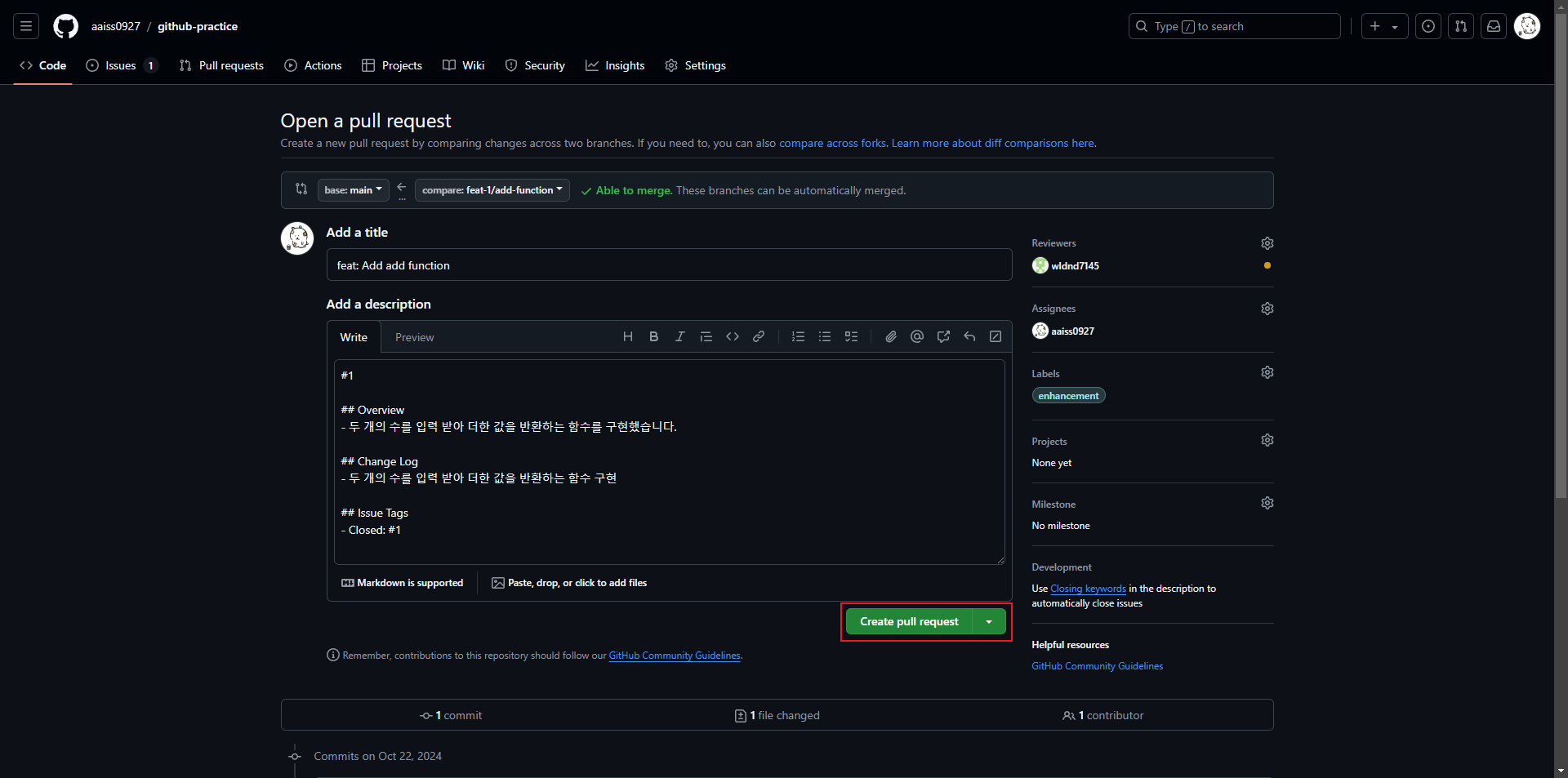 (Reviewer 화면) Review를 원하는 라인에 커서를 올리면 [+] 버튼 팝업 -> 클릭 시 해당 라인 리뷰