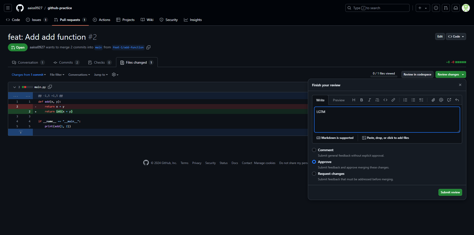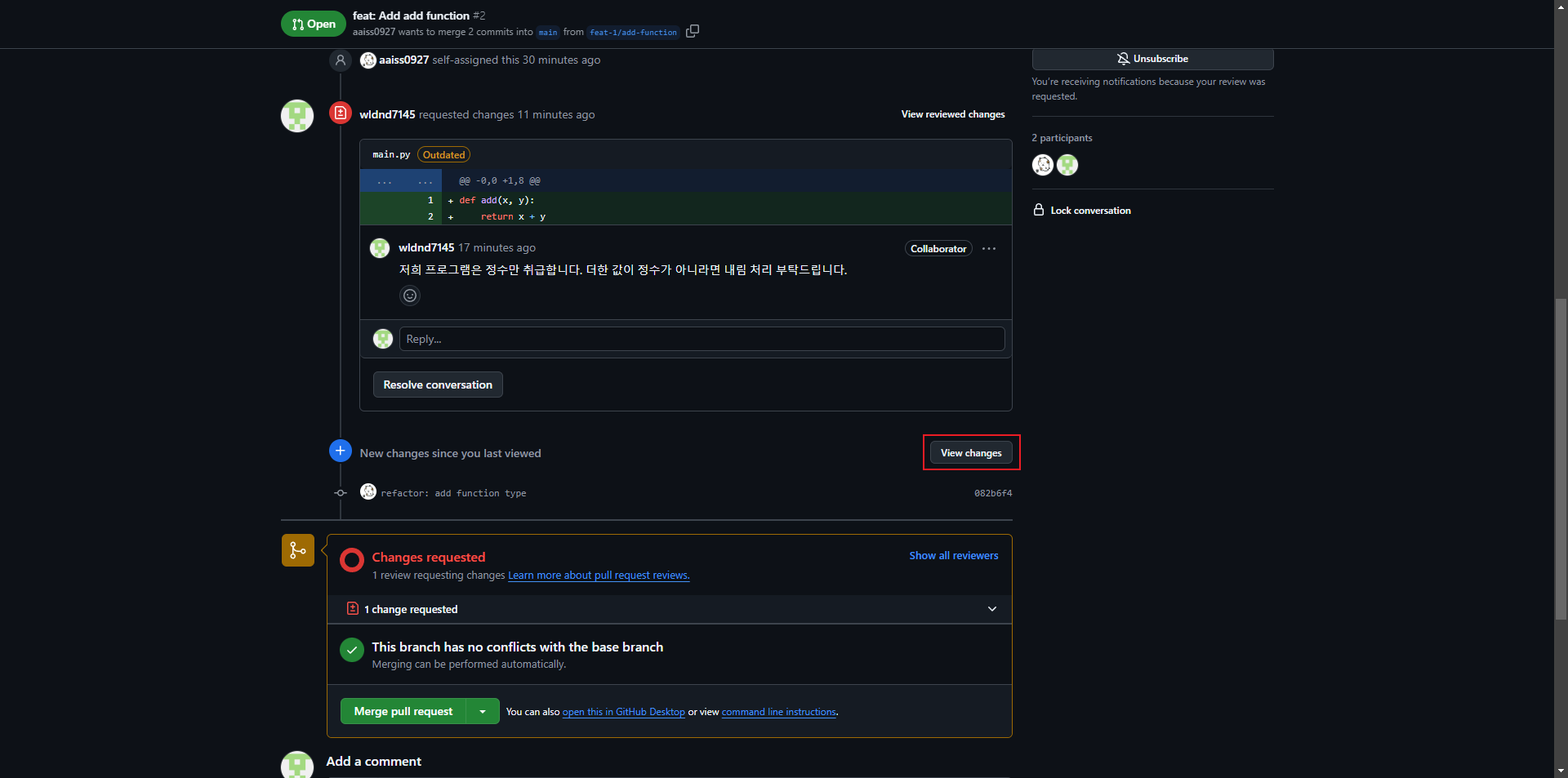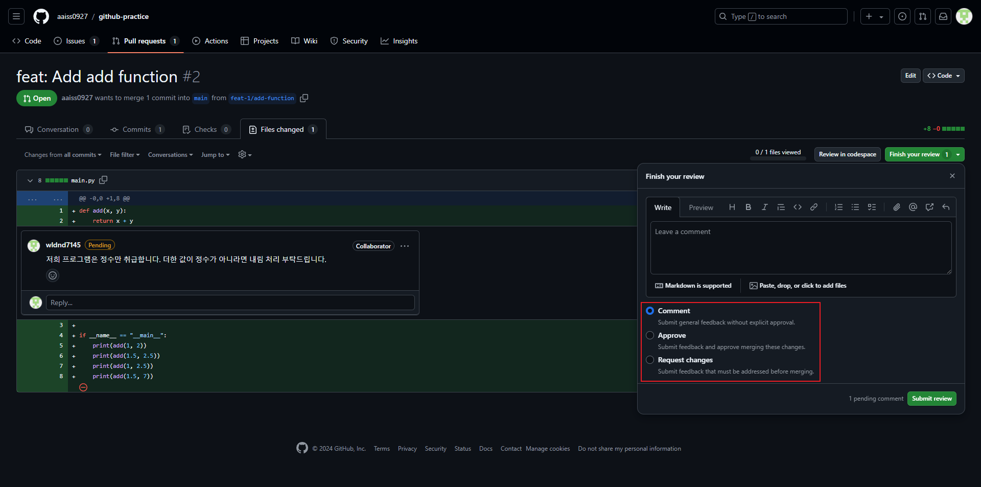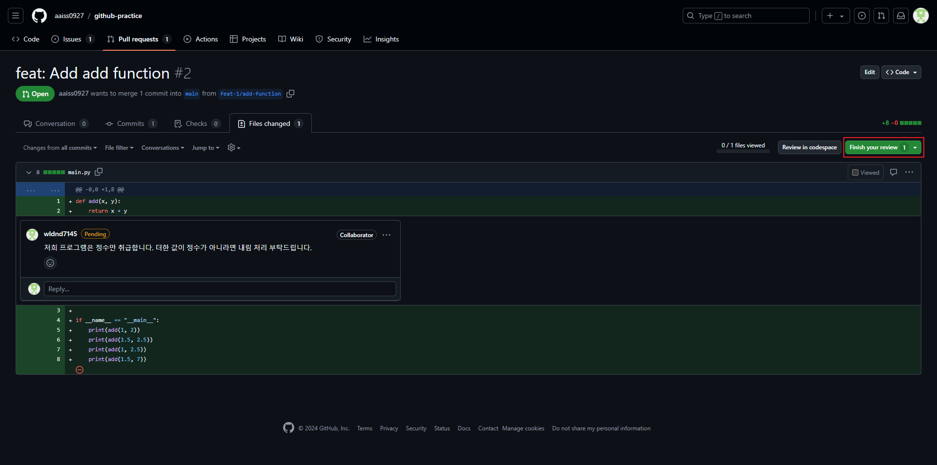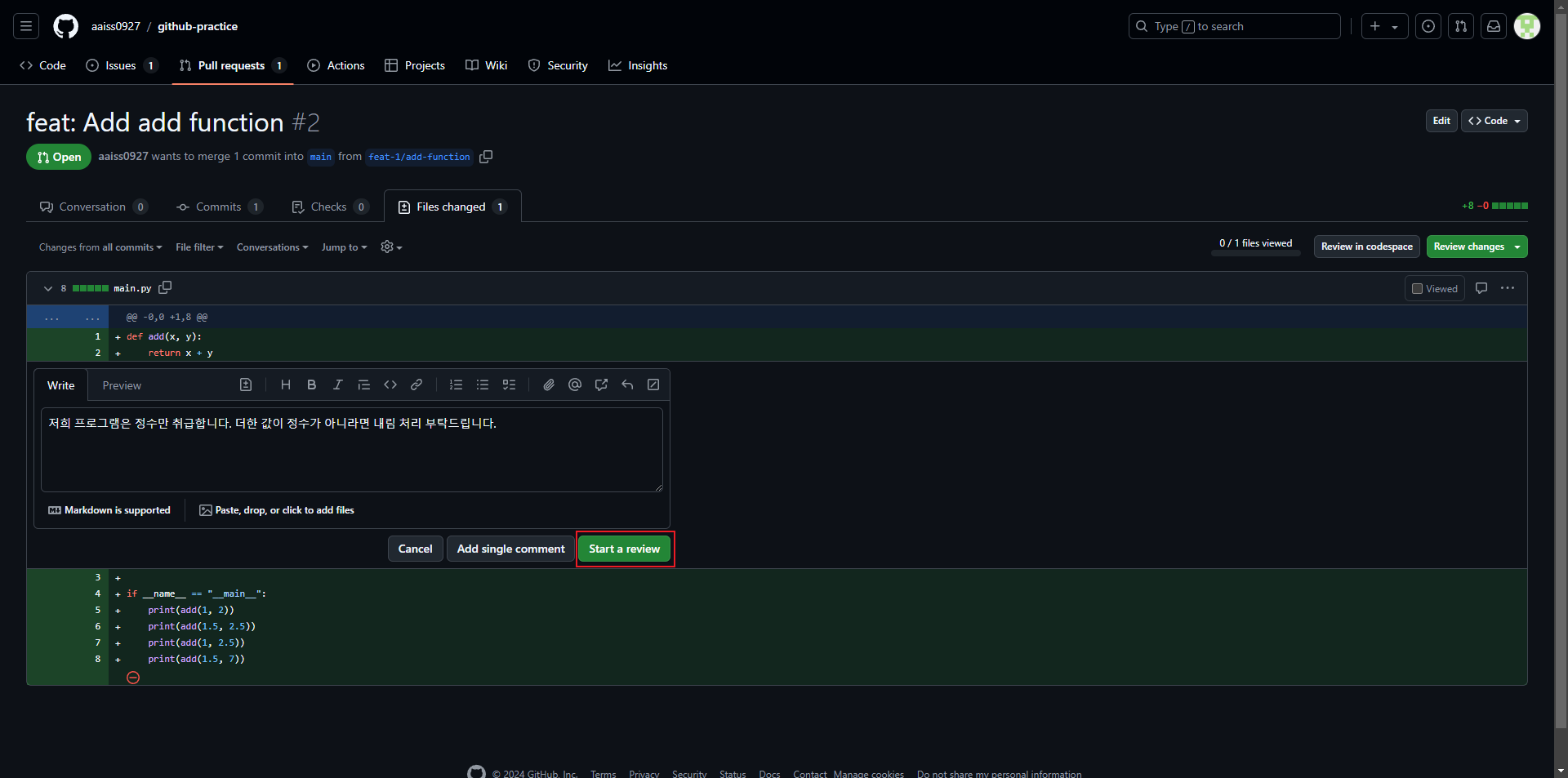 (Reviewer 화면) 리뷰 작성 및 "Start a review" 클릭