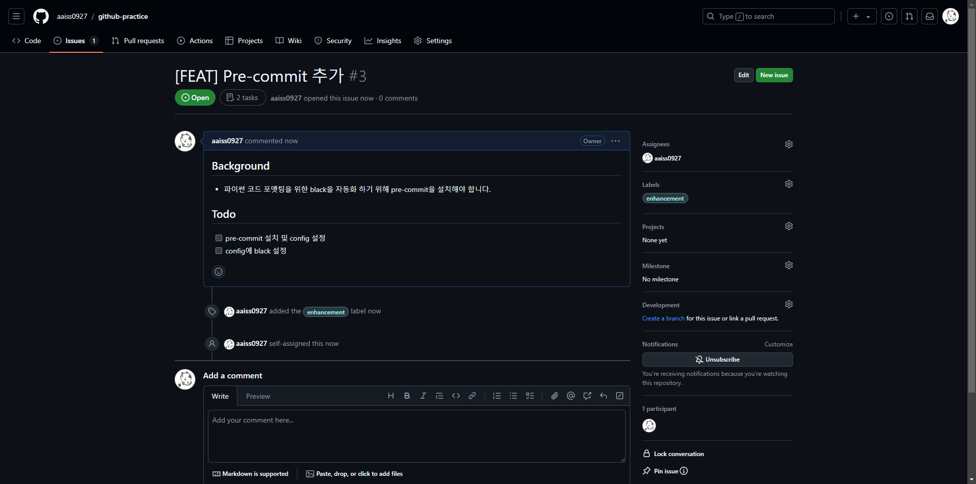 - 파이썬 코드 포맷팅을 위한 black을 자동화 하기 위해 pre-commit을 설치해야 합니다.