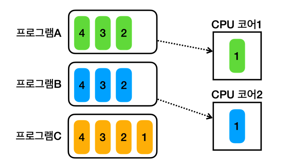멀티코어는 스케줄링 큐에 존재하는 스레드(from프로세스)들을 스위칭하며 처리하는 것이다.