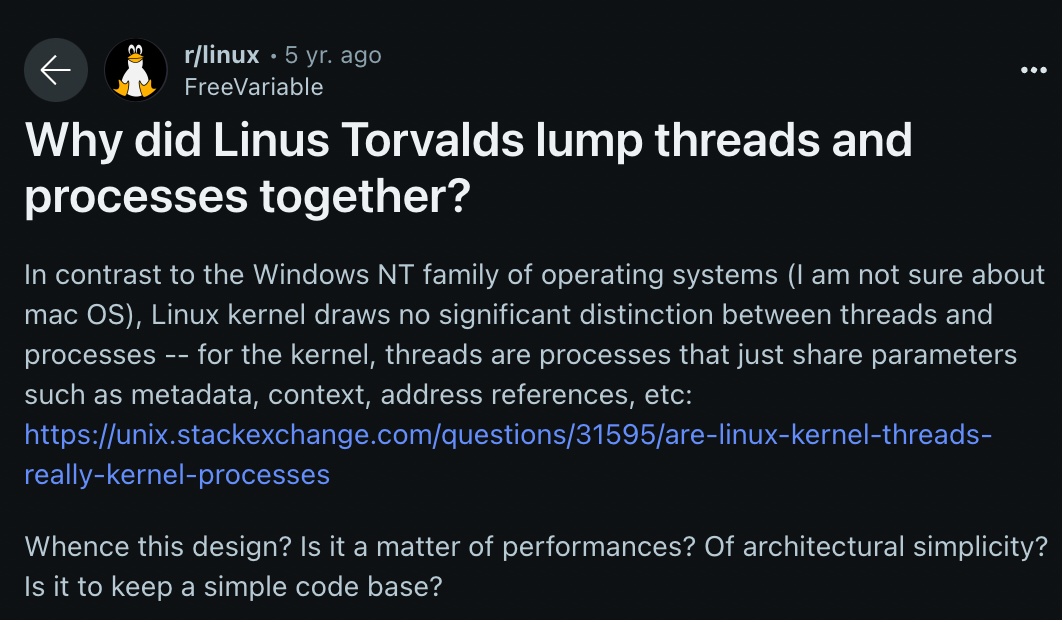 리눅스 커널 개발자에게 누군가 “스레드와 프로세스는 명확히 구분되어야 하지 않느냐”고 묻자, 그는 “굳이 그렇게 나눌 필요는 없다”고 답했다. 실제로 리눅스에서는 스레드와 프로세스를 구조적으로 동일하게 다루며, 내부적으로는 모두 태스크(task) 로 처리된다.