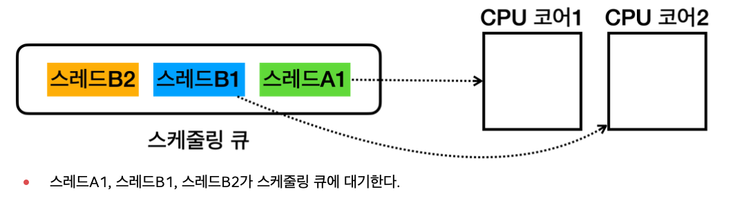 모든 스레드는 여기서 줄을 서게 되고 CPU의 코어들은 이를 OS의 스케줄링 알고리즘에 따라 처리한다.