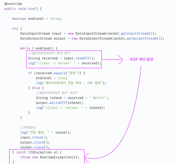 클라이언트가 비정상 종료되었으므로 해당 서버 쓰레드는 while을 통해 반복적으로 input.readUTF()를 수행하던 코드에서 예외가 발생한다. try문에서 예외가 발생했으므로 catch로 곧장 가버려 런타임예외를 던지고 코드는 끝난다.